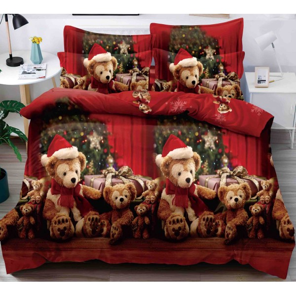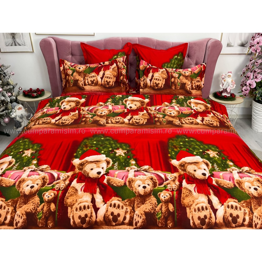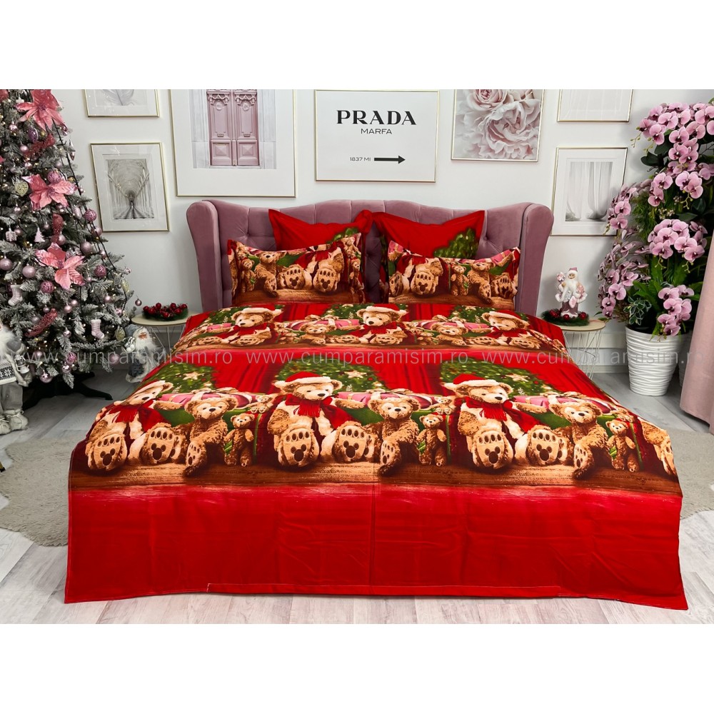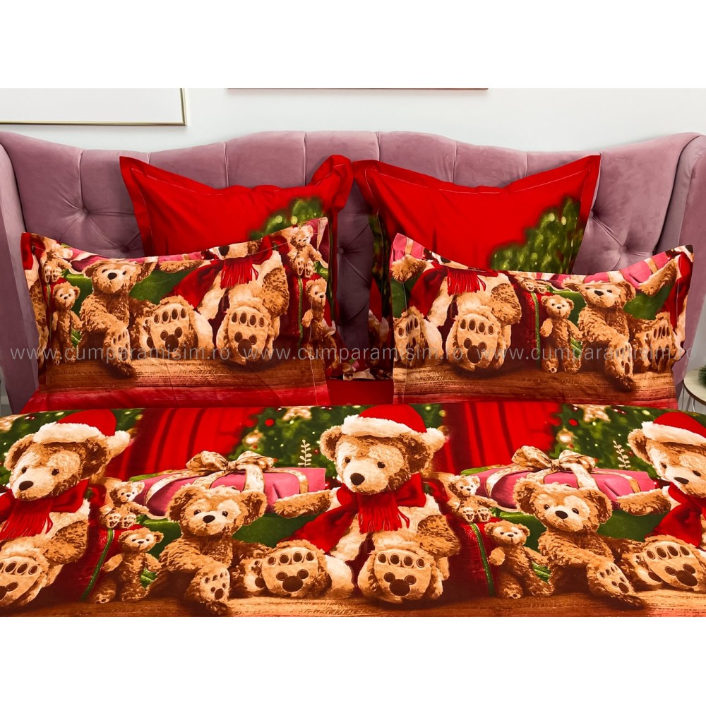 Lenjerie pat dublu, FINET, 6 piese, cu ELASTIC, Craciun, Jojo Home, Rosu-Multicolor, ursuleti, cadouri, cod produs: JOM123