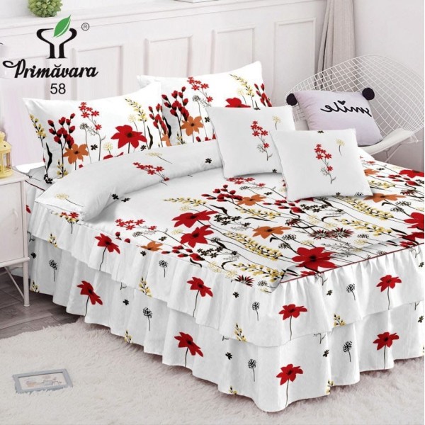 Lenjerie pat dublu, FINET, 6 piese, cu VOLANASE, Alb-Rosu, flori, Primavara Casa, cod produs: PRV57