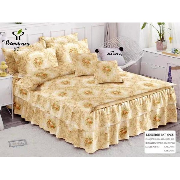 Lenjerie pat dublu, FINET, 6 piese, cu VOLANASE, Bej, flori, Primavara Casa, cod produs: PRV21