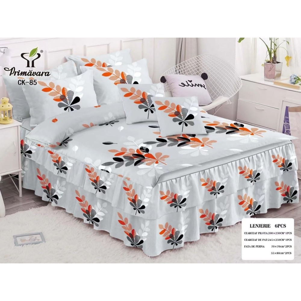 Lenjerie pat dublu, FINET, 6 piese, cu VOLANASE, Gri, frunze, Primavara Casa, cod produs: PRV32