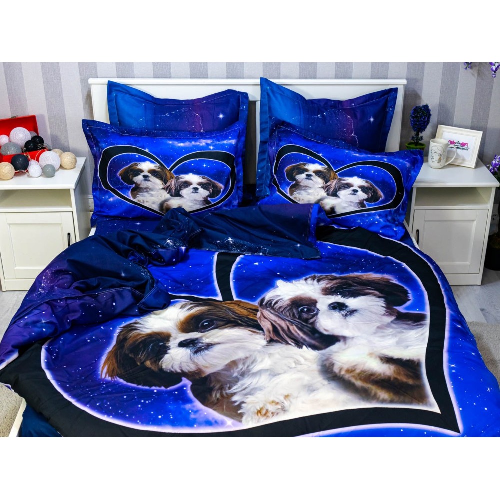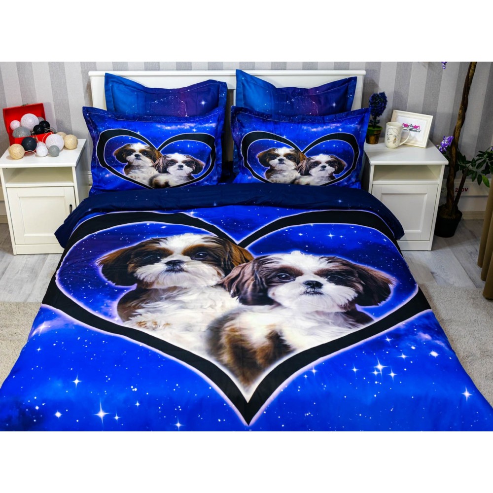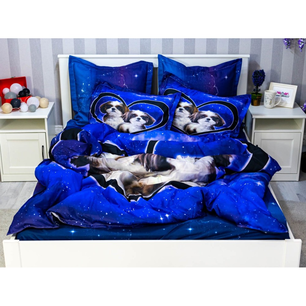 Lenjerie pat dublu, FINET, 6 piese, IDENTICA CU POZA, Albastru, catelusi, Johny Home Pucioasa, cod produs: SPR-A2-17