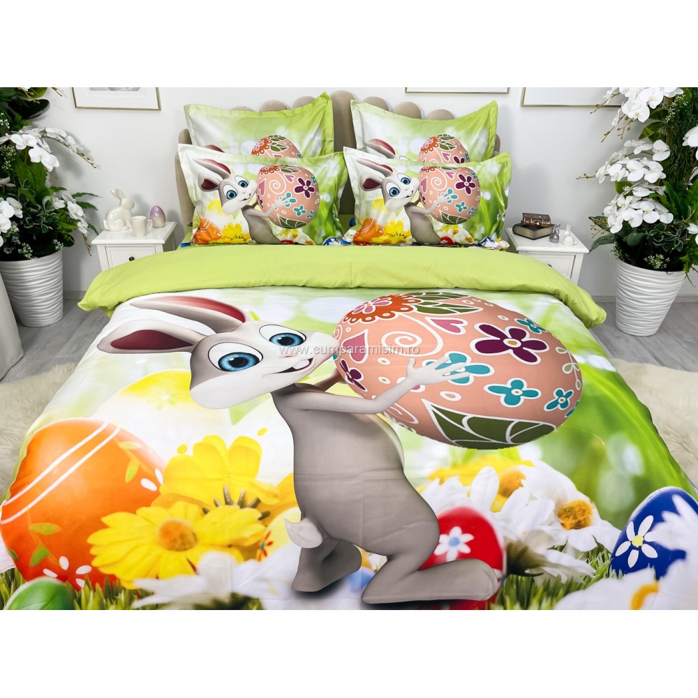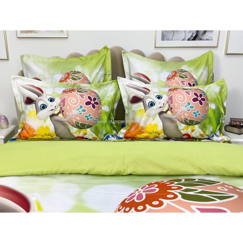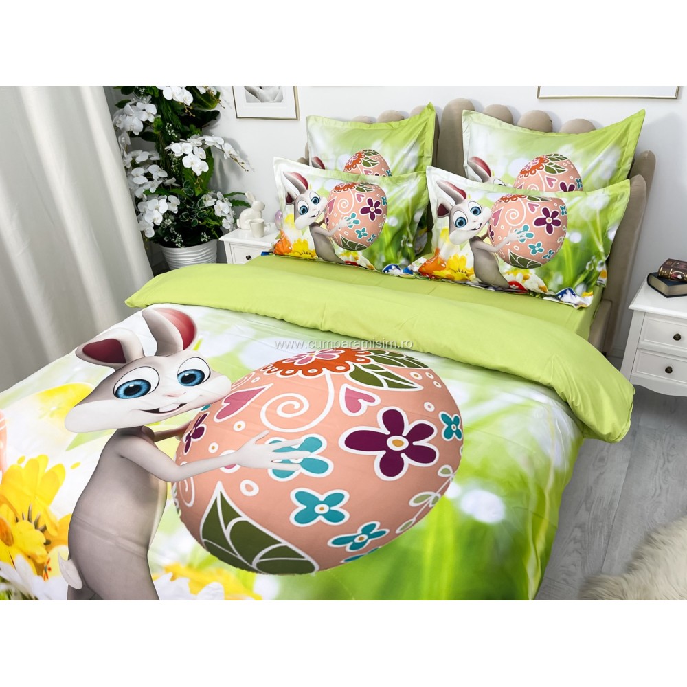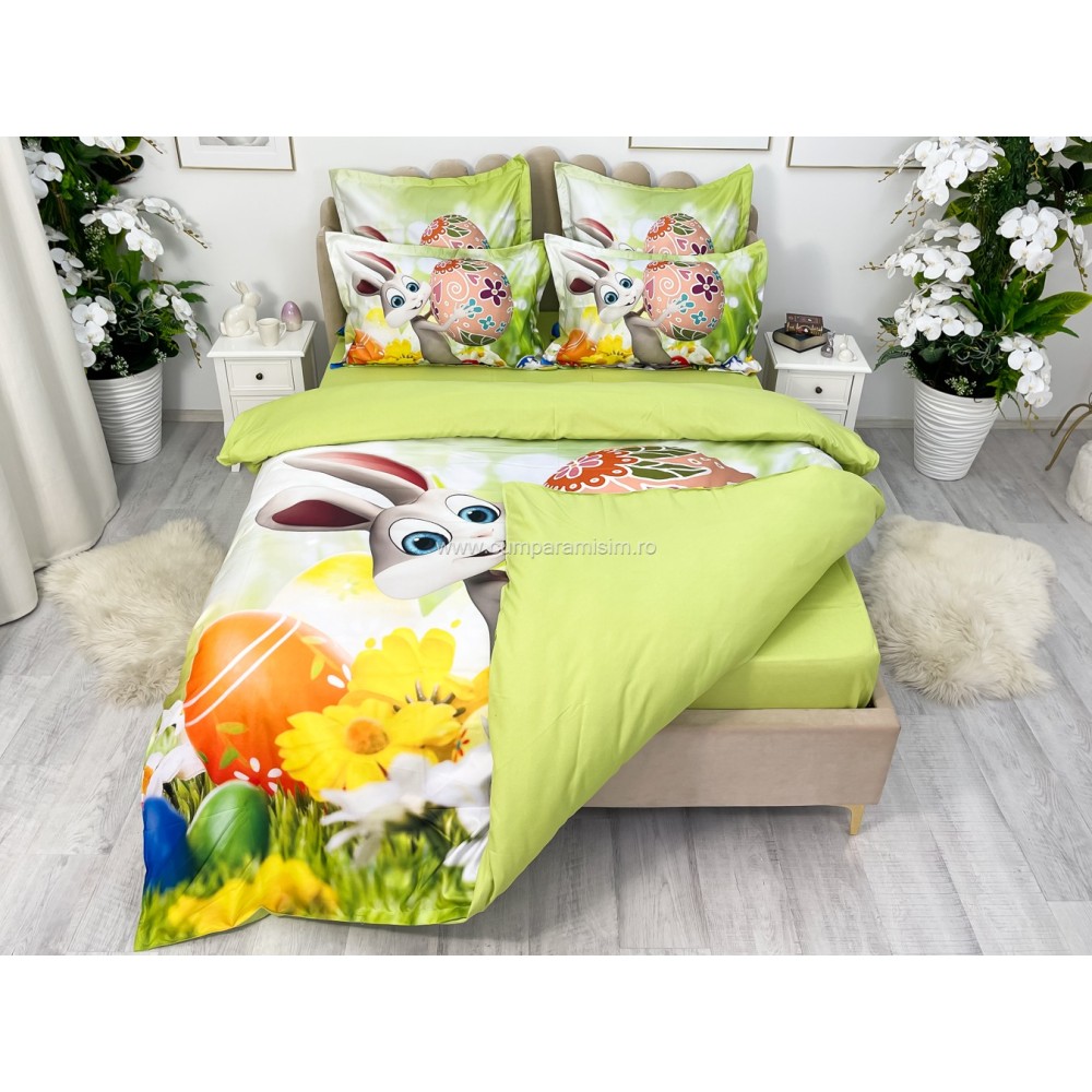 Lenjerie pat dublu, FINET, 6 piese, IDENTICA CU POZA, Verde-Multicolor, iepuras, flori, Alti producatori, cod produs: FYN257