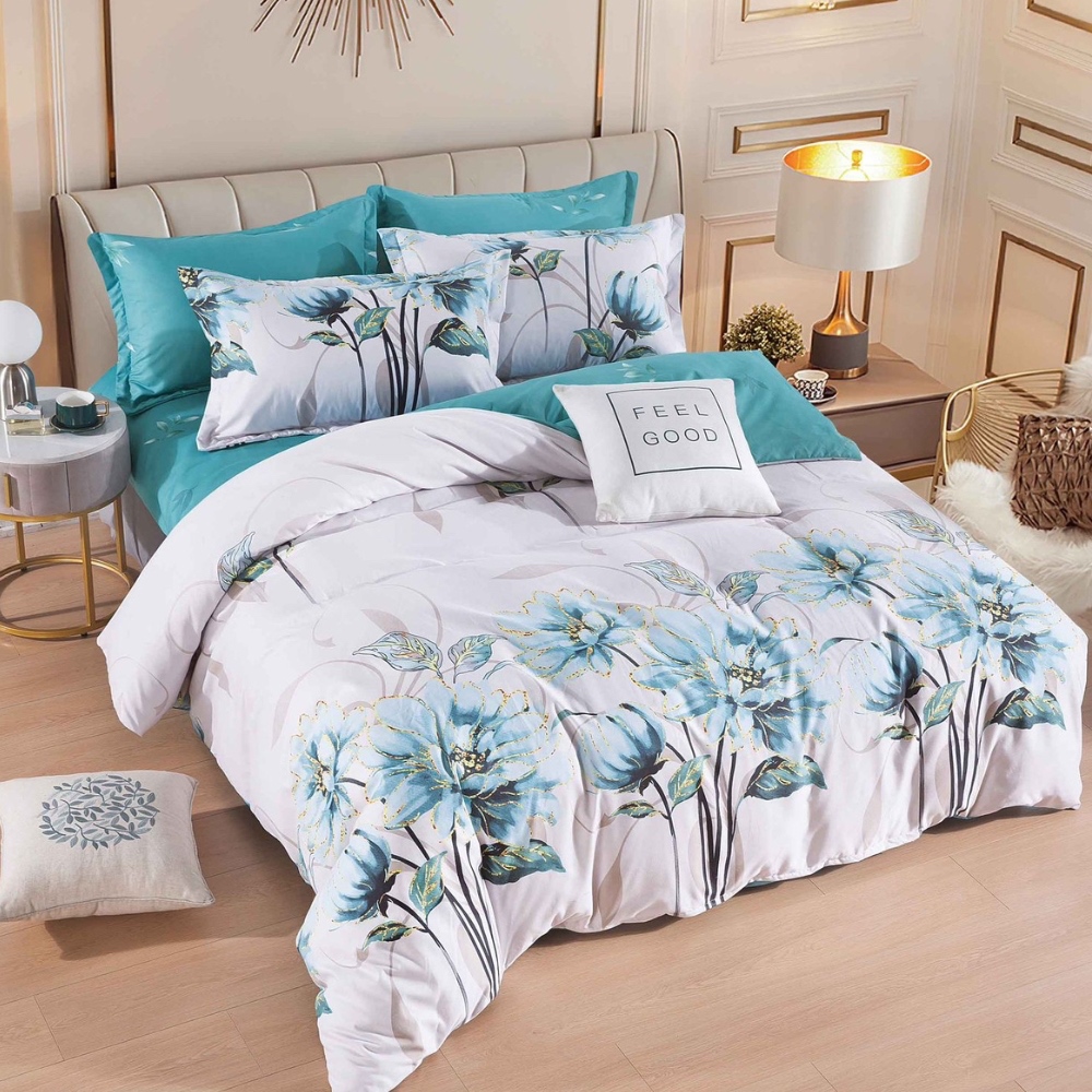 Lenjerie pat dublu, FINET, 6 piese, Jojo Home, Alb, Bleu, flori, cod produs: JOF201