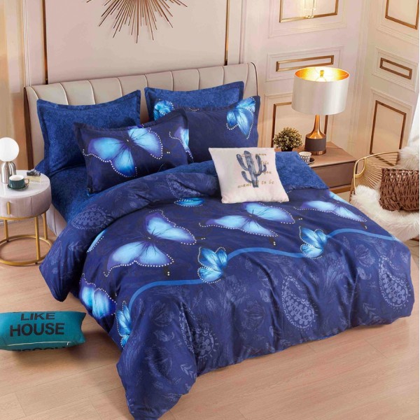 Lenjerie pat dublu, FINET, 6 piese, Jojo Home, Albastru, fluturi, cod produs: JOF176