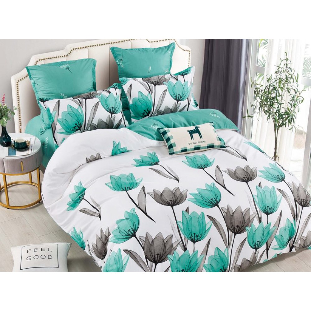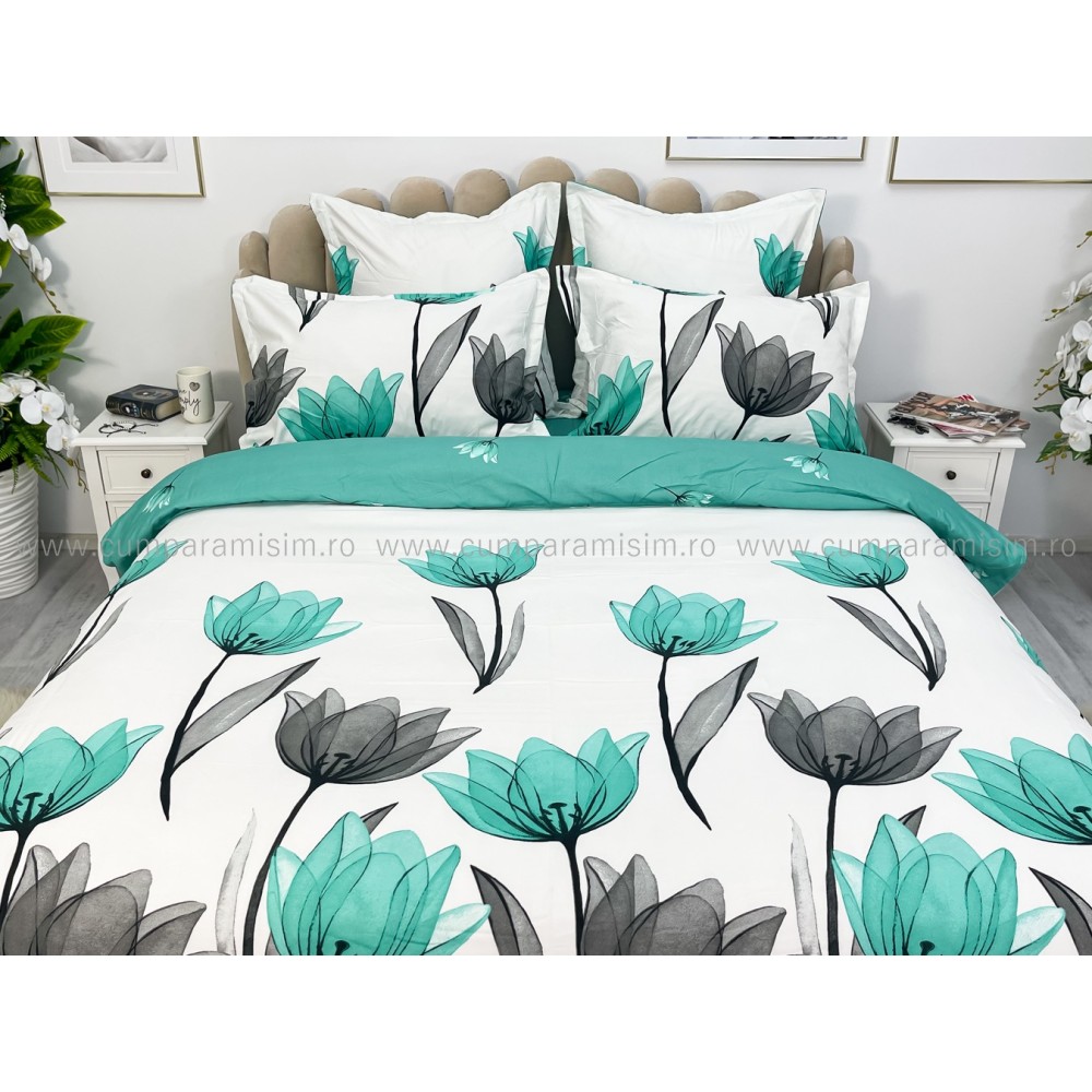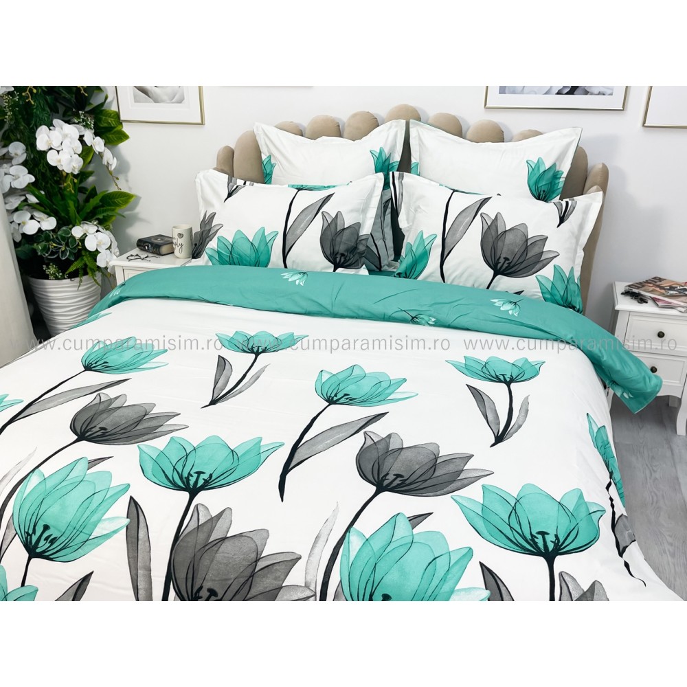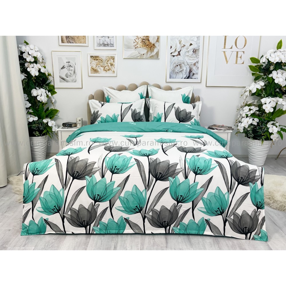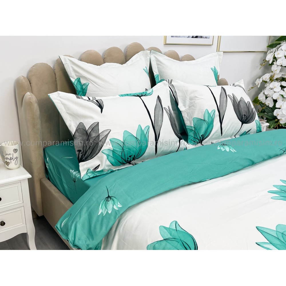 Lenjerie pat dublu, FINET, 6 piese, Jojo Home, Alb-Verde Aqua, lalele, cod produs: JOF65