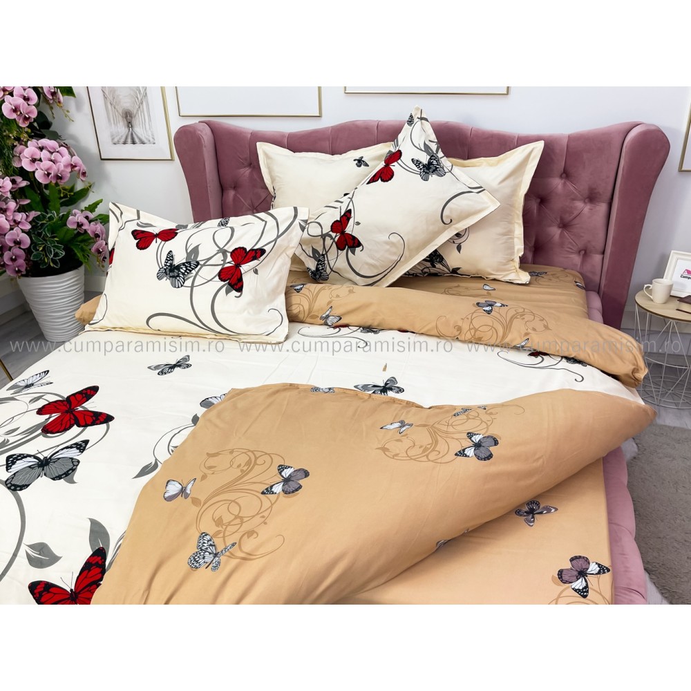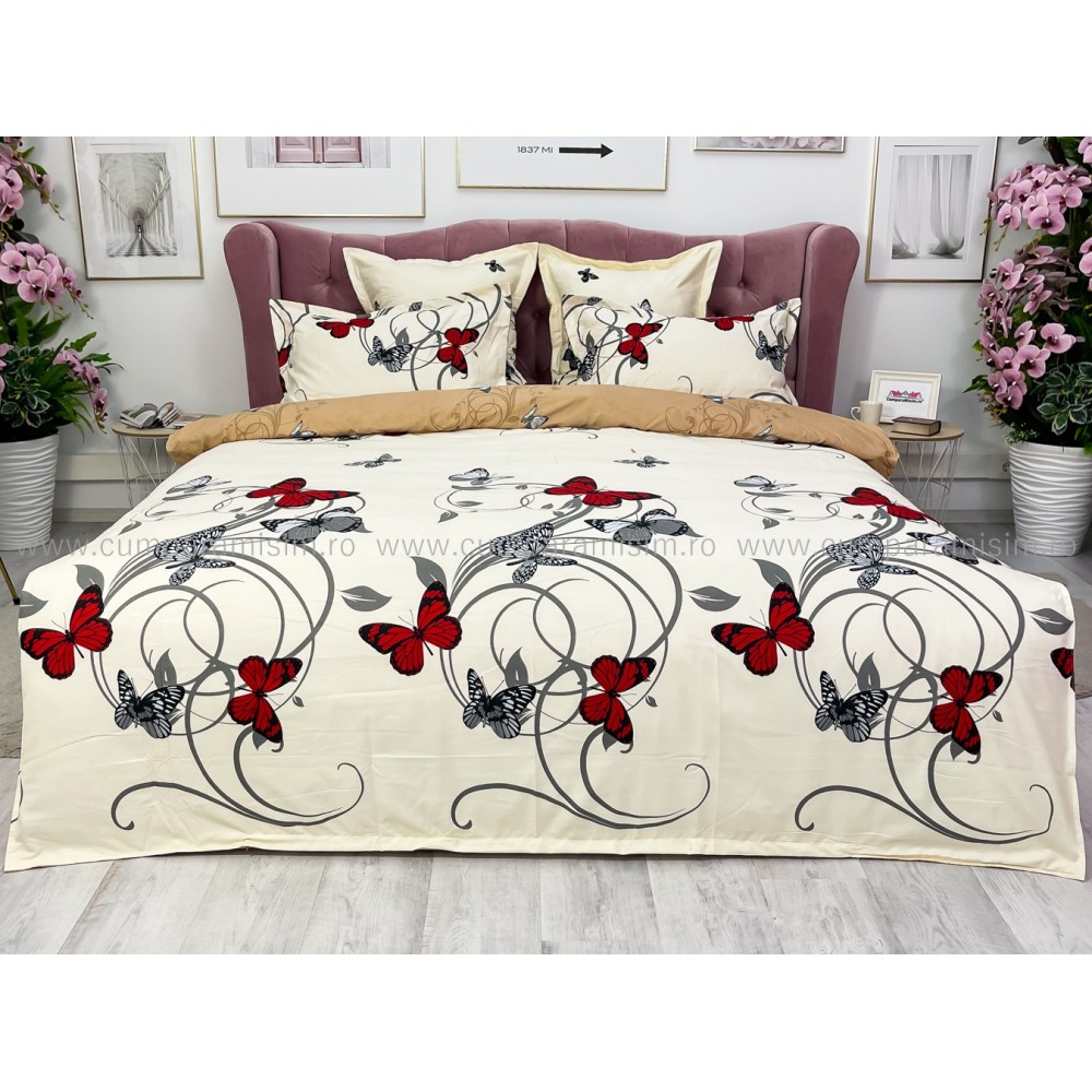 Lenjerie pat dublu, FINET, 6 piese, Jojo Home, Crem-Negru-Rosu, fluturi, cod produs: JOF44