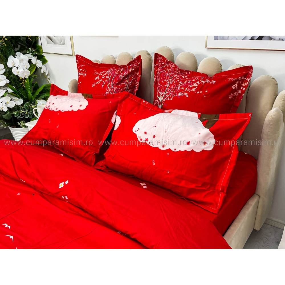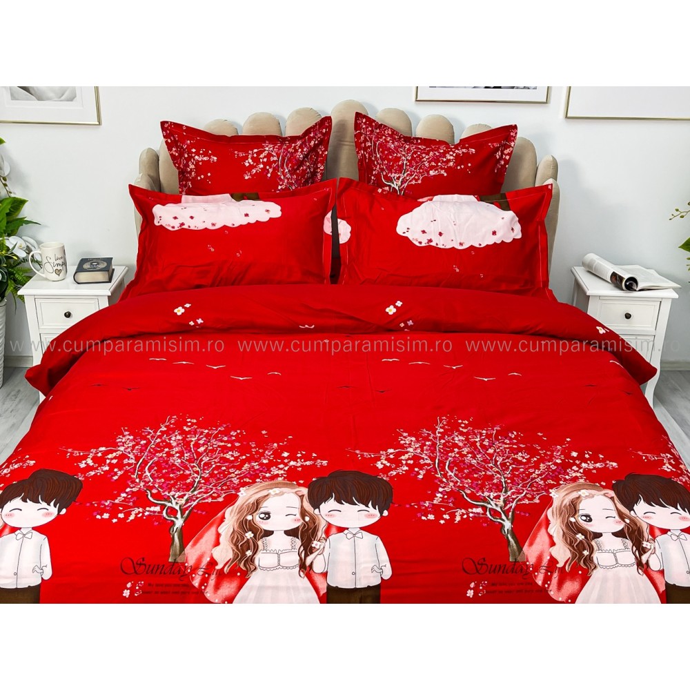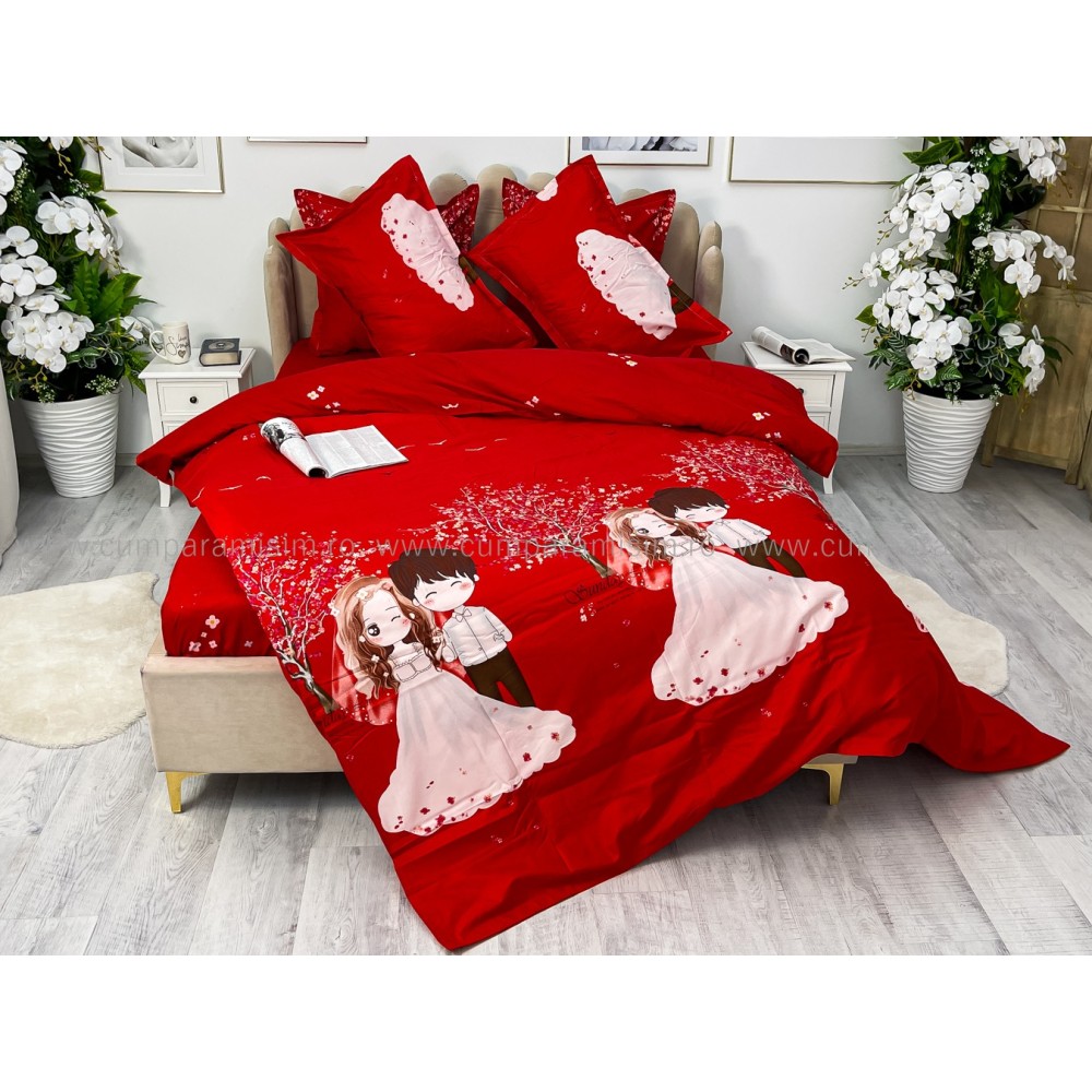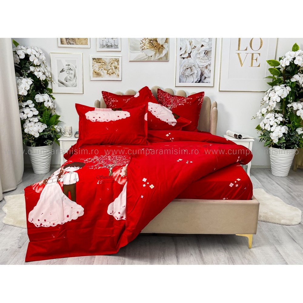 Lenjerie pat dublu, FINET, 6 piese, Jojo Home, Rosu-Multicolor, indragostiti, cod produs: JOF12