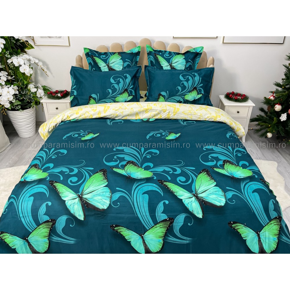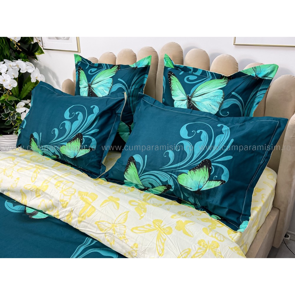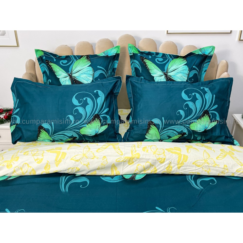 Lenjerie pat dublu, FINET, 6 piese, Jojo Home, Turquoise-Multicolor, fluturi, cod produs: JOF19