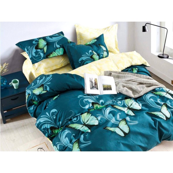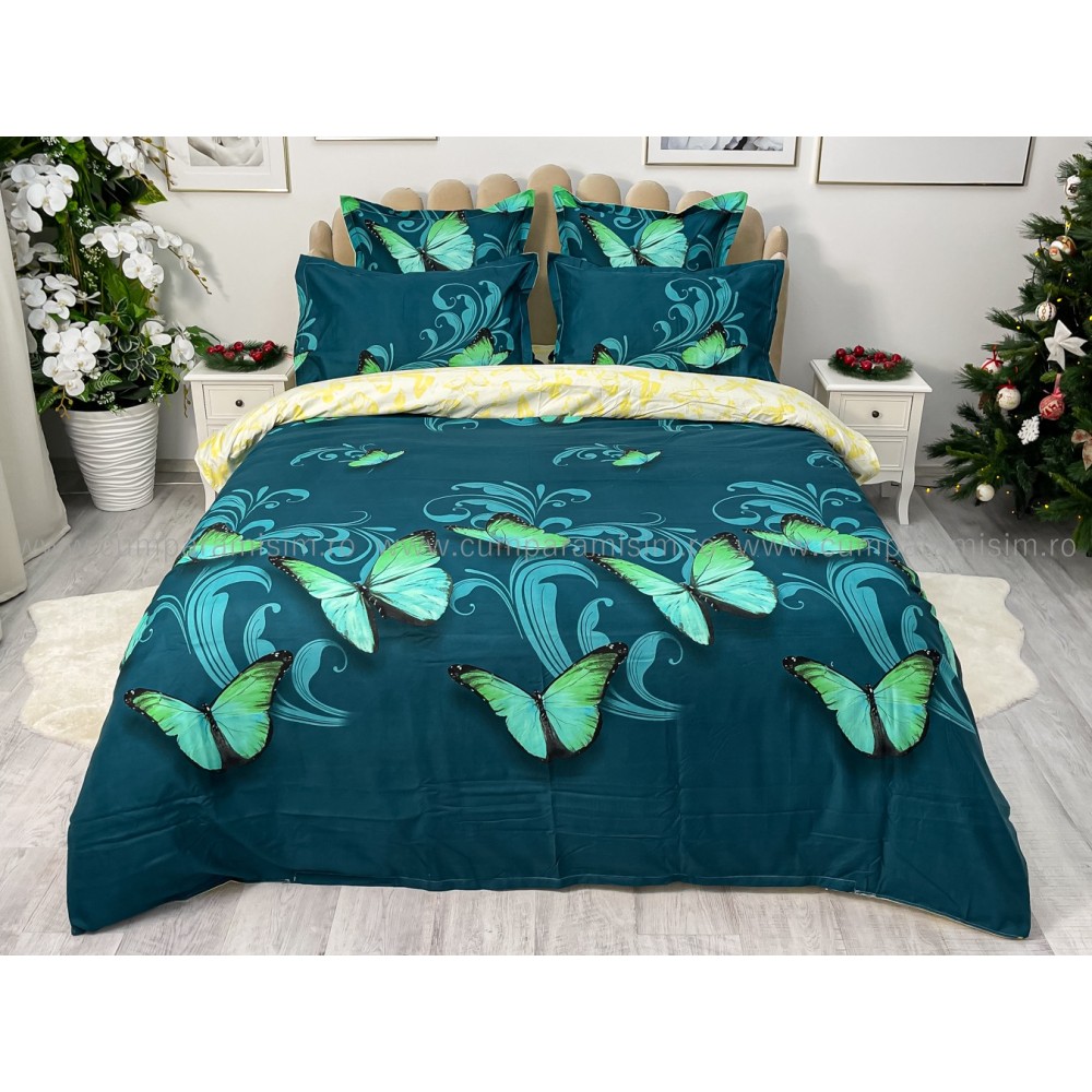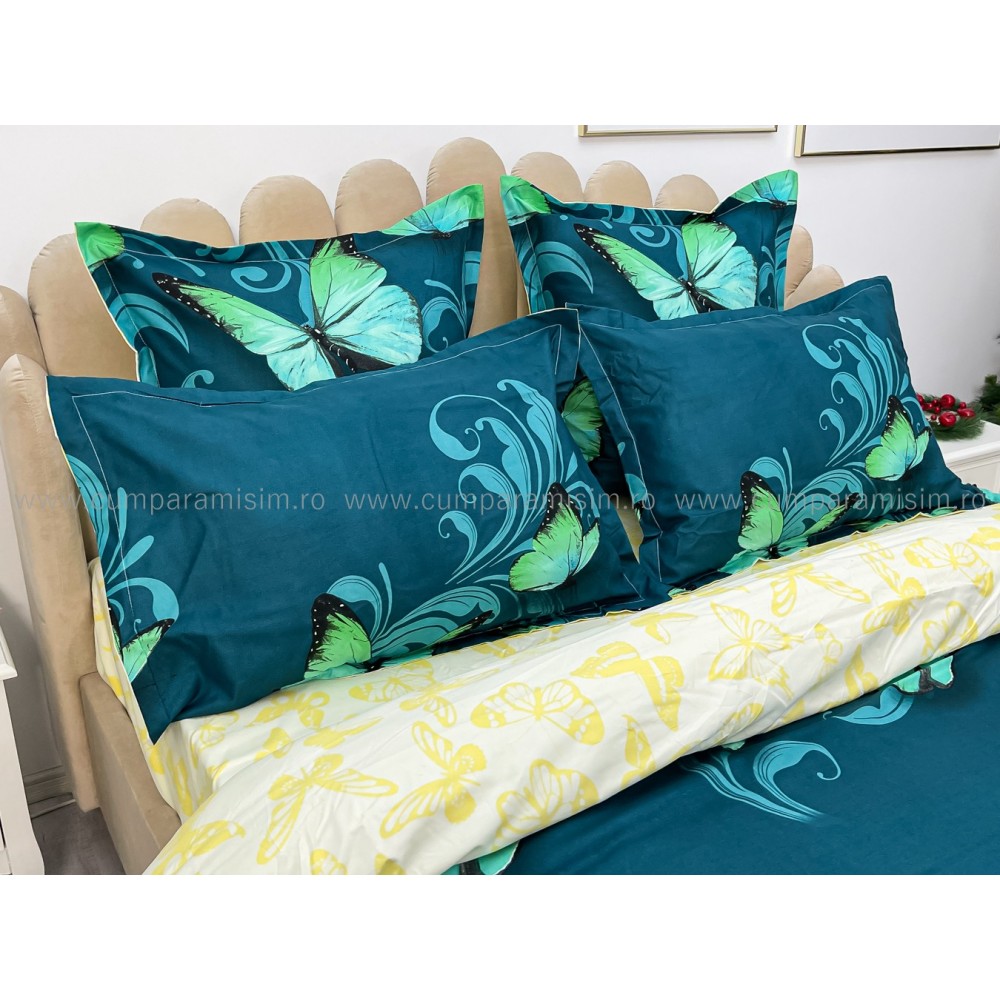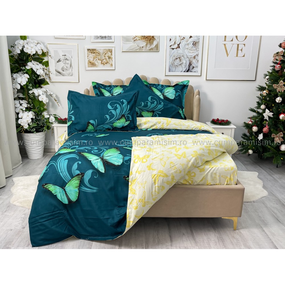 Lenjerie pat dublu, FINET, 6 piese, Jojo Home, Turquoise-Multicolor, fluturi, cod produs: JOF19
