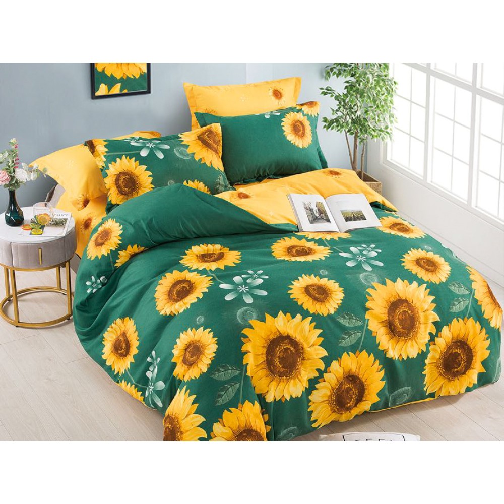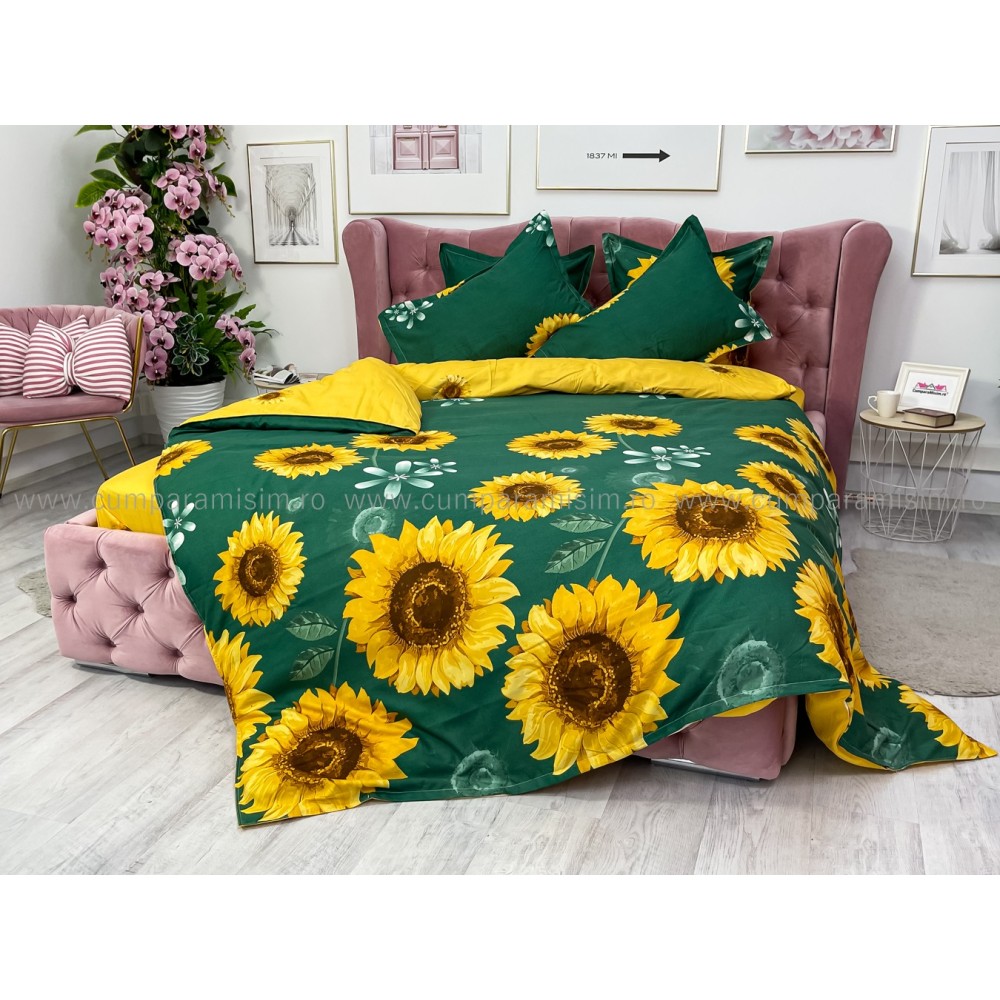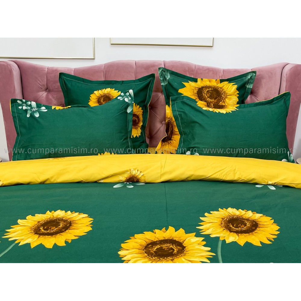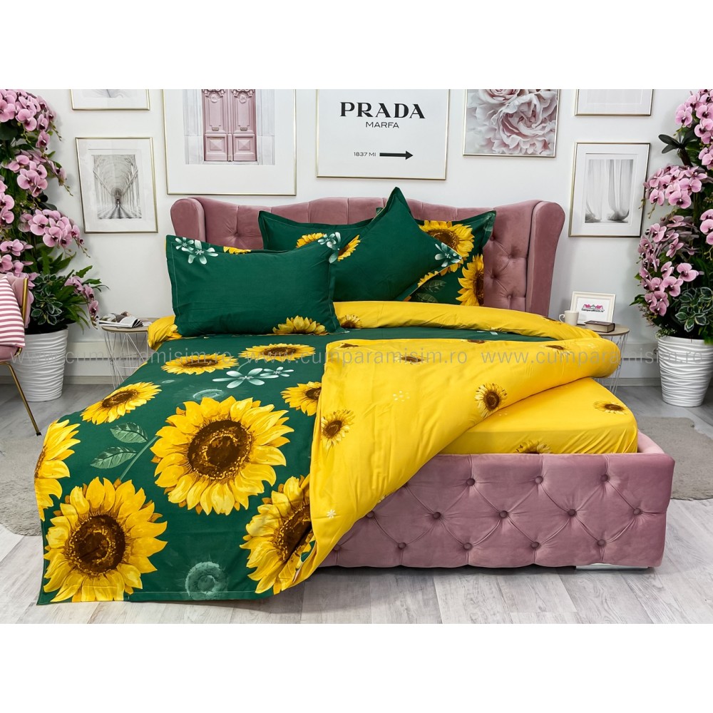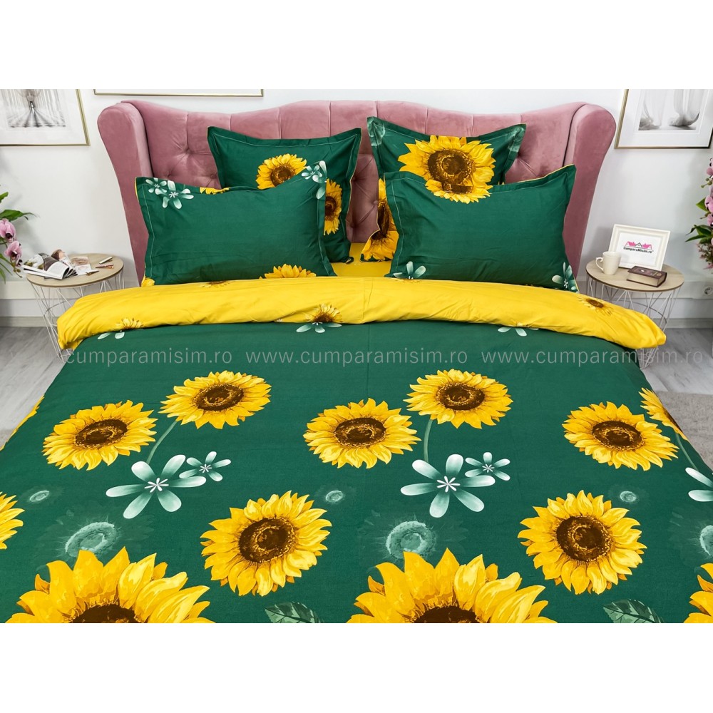 Lenjerie pat dublu, FINET, 6 piese, Jojo Home, Verde-Galben, florea soarelui, cod produs: JOF73