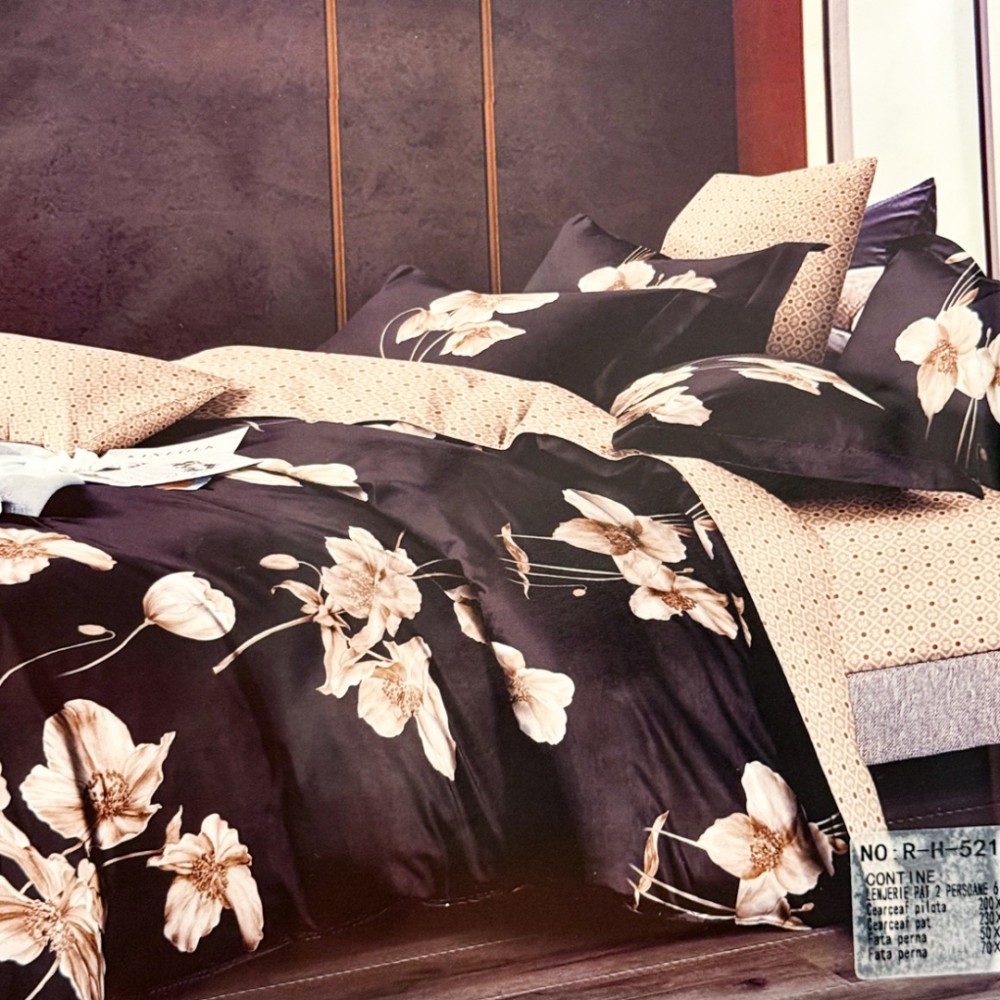 Lenjerie pat dublu, FINET, 6 piese, Negru, Bej, flori, Johny Home Pucioasa, cod produs: DKF197