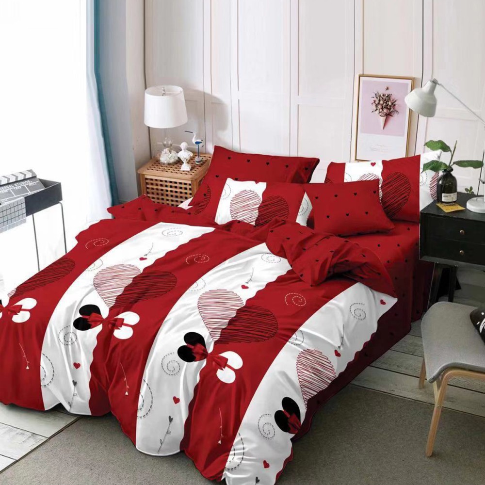 Lenjerie pat dublu, Ralex Pucioasa, Finet, 6 piese, Alb-Rosu, inimioare, dungi, fundite, cod produs: RXF13