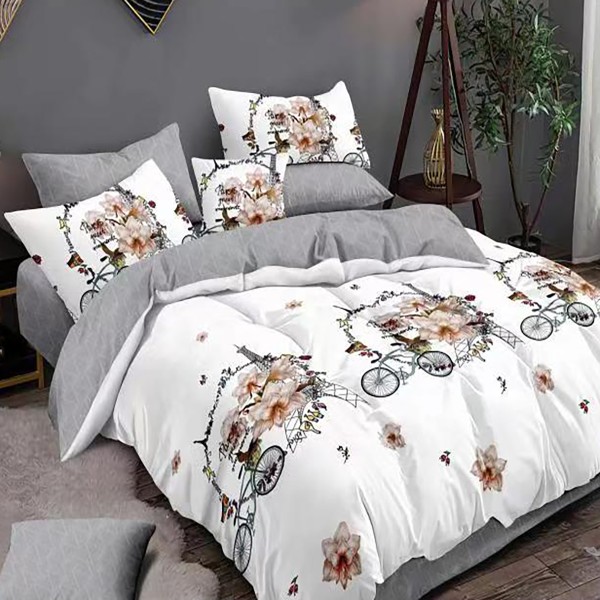 Lenjerie pat dublu, Ralex Pucioasa, Bumbac Finet, 6 piese, Alb-Gri, flori, biciclete, cod produs: RXF38