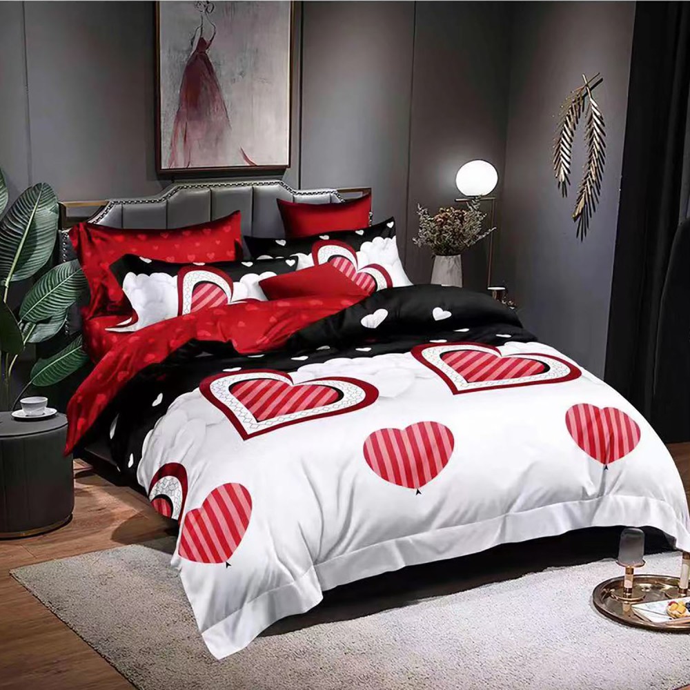 Lenjerie pat dublu, Ralex Pucioasa, Bumbac Finet, 6 piese, Alb-Rosu, inimioare, cod produs: RXF63