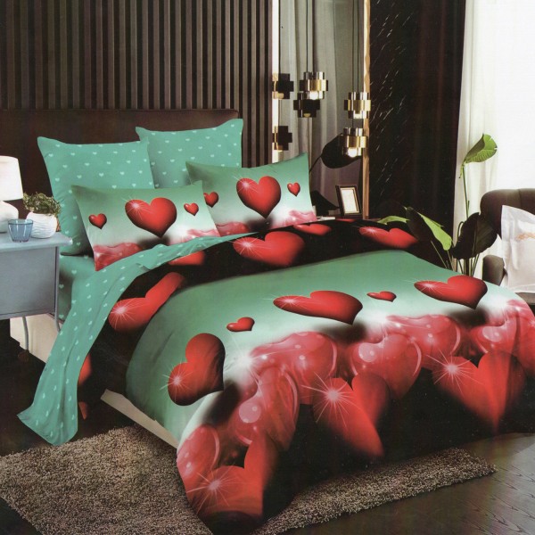 Lenjerie pat dublu, Ralex Pucioasa, Finet, 6 piese, Verde-Rosu, inimioare, cod produs: RXF66