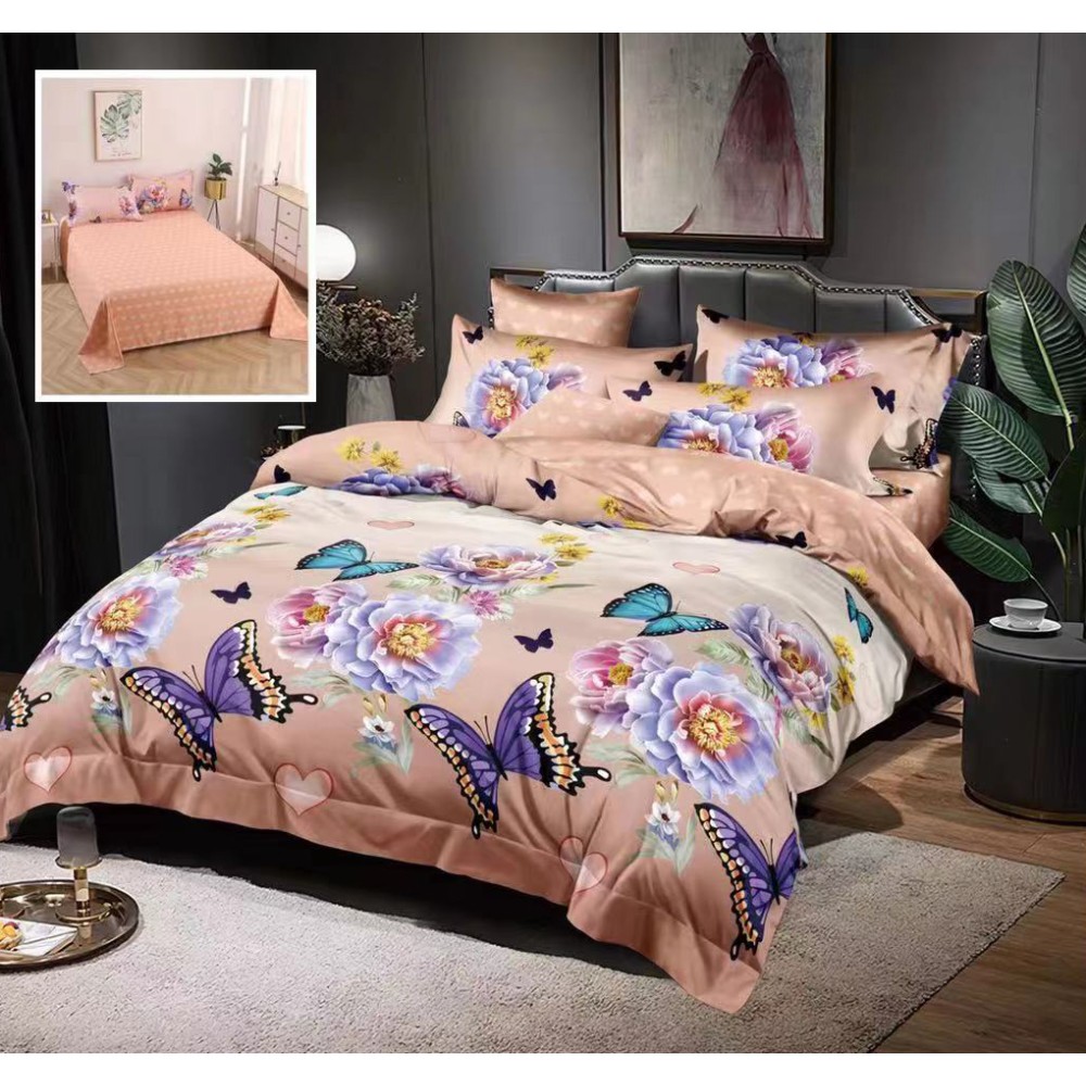 Lenjerie pat dublu, Ralex Pucioasa, Finet, 6 piese, Bej, flori, fluturi, cod produs: RXF76
