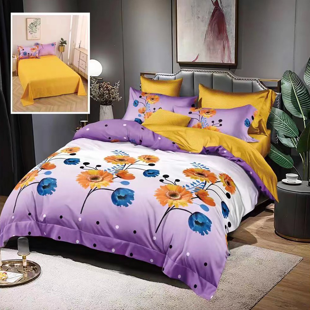 Lenjerie pat dublu, Ralex Pucioasa, Finet, 6 piese, Mov-Mustar, flori, cod produs: RXF77