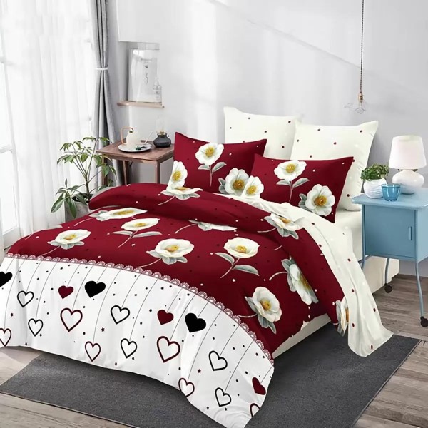 Lenjerie pat dublu, Ralex Pucioasa, Bumbac Finet, 6 piese, Alb-Rosu, flori, inimioare, cod produs: RXF83