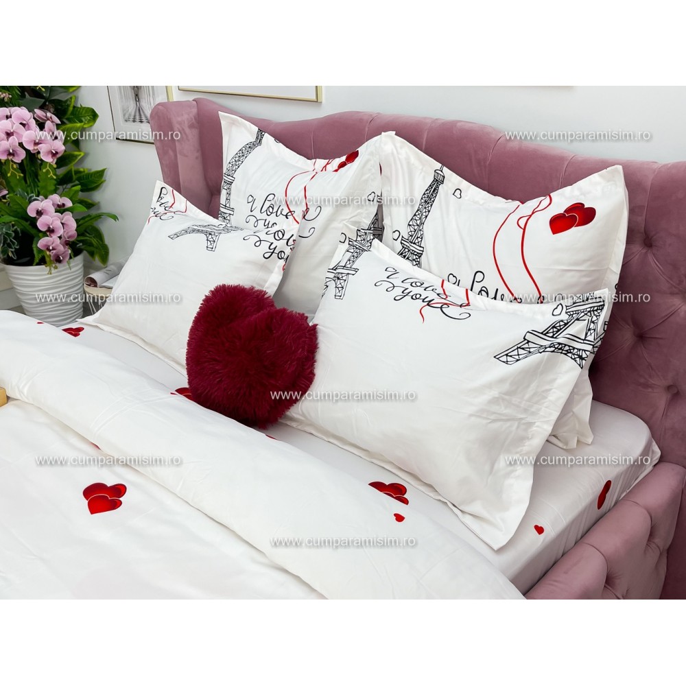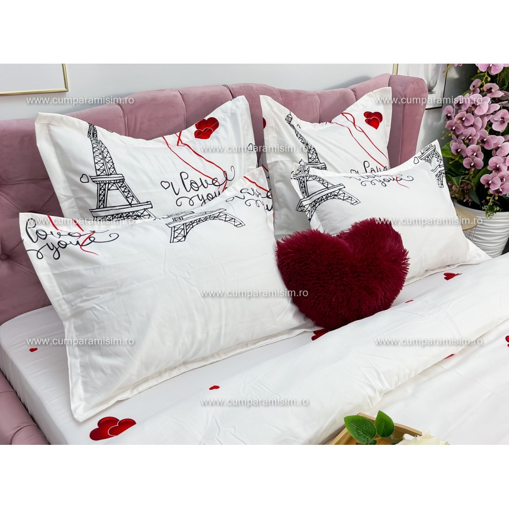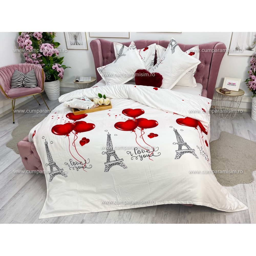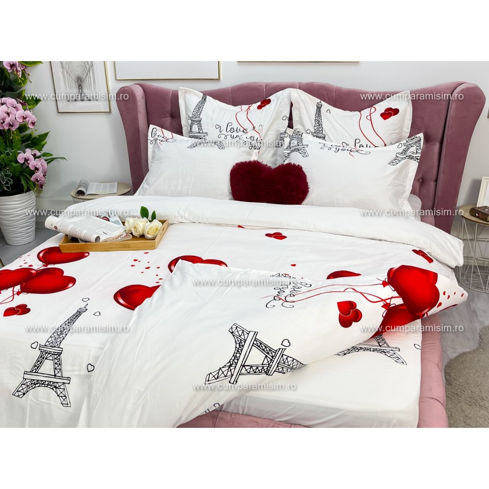 Lenjerie pat dublu, Ralex Pucioasa, Finet, 6 piese, Alb-Rosu, inimioare, turnul Eiffel, cod produs: RXF96