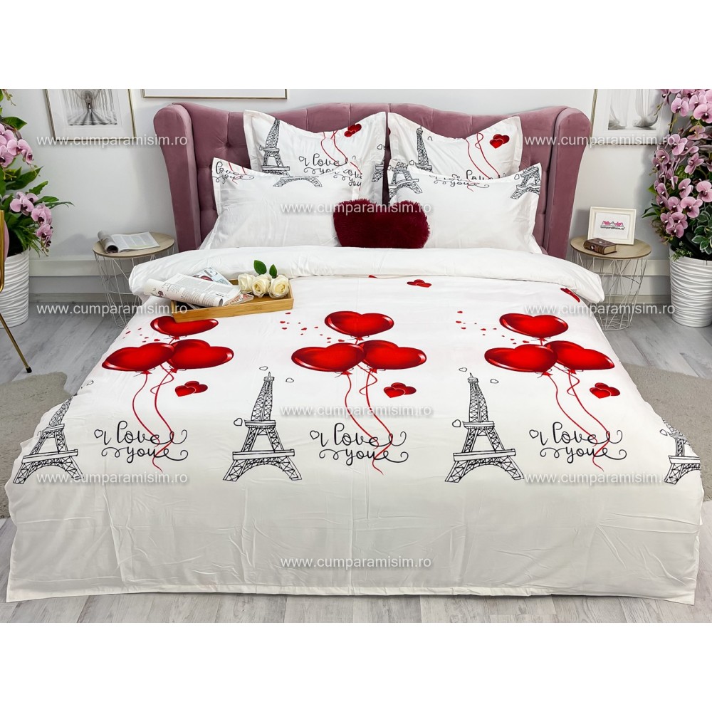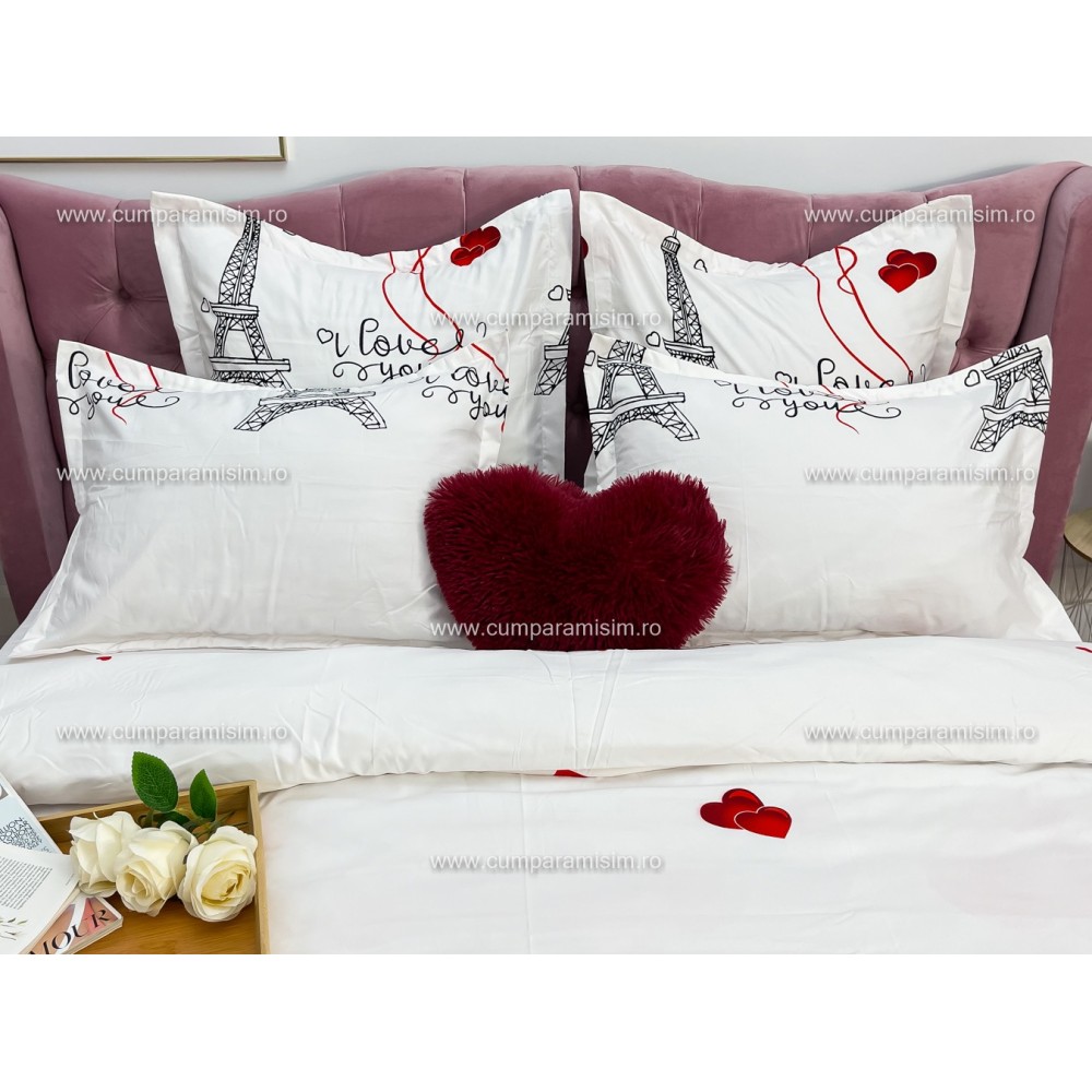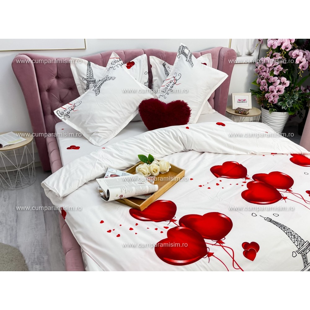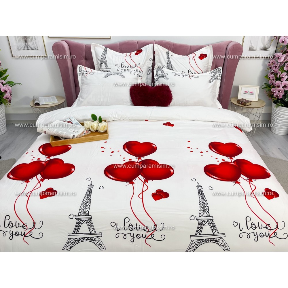 Lenjerie pat dublu, Ralex Pucioasa, Finet, 6 piese, Alb-Rosu, inimioare, turnul Eiffel, cod produs: RXF96