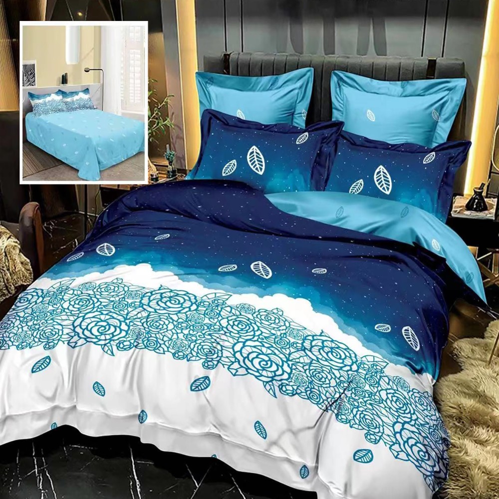Lenjerie pat dublu, Ralex Pucioasa, Finet, 6 piese, Albastru, flori, frunze, cod produs: RXF104
