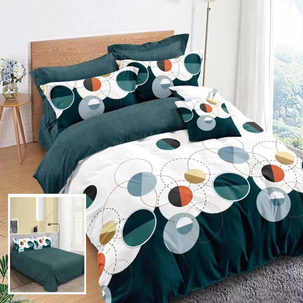 Lenjerie pat dublu, Ralex Pucioasa, Finet, 6 piese, Alb-Verde, cercuri, cod produs: RXF106