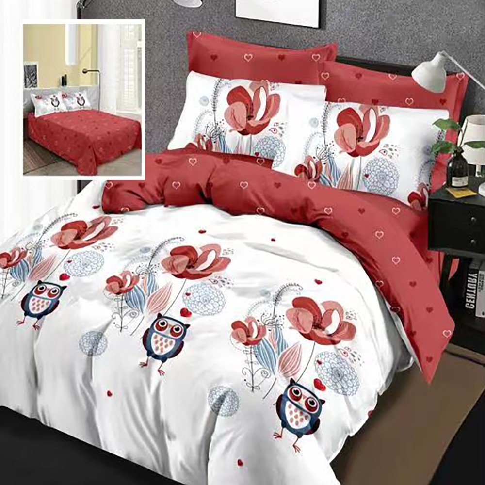 Lenjerie pat dublu, Ralex Pucioasa, Bumbac Finet, 6 piese, Alb, bufnite, flori, cod produs: RXF119