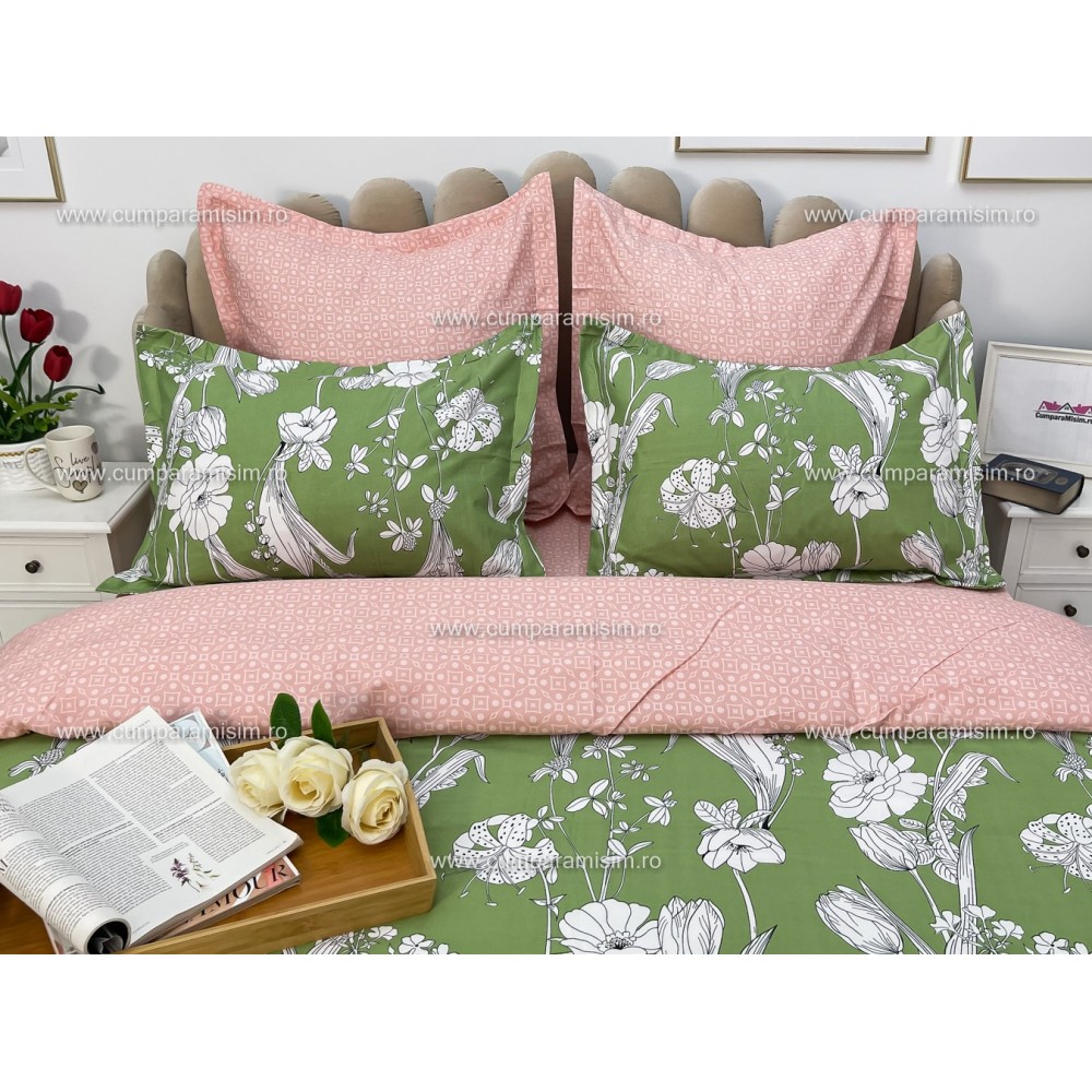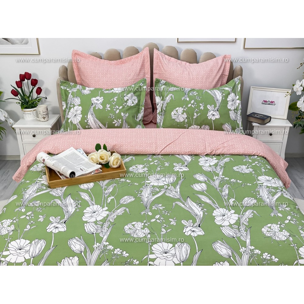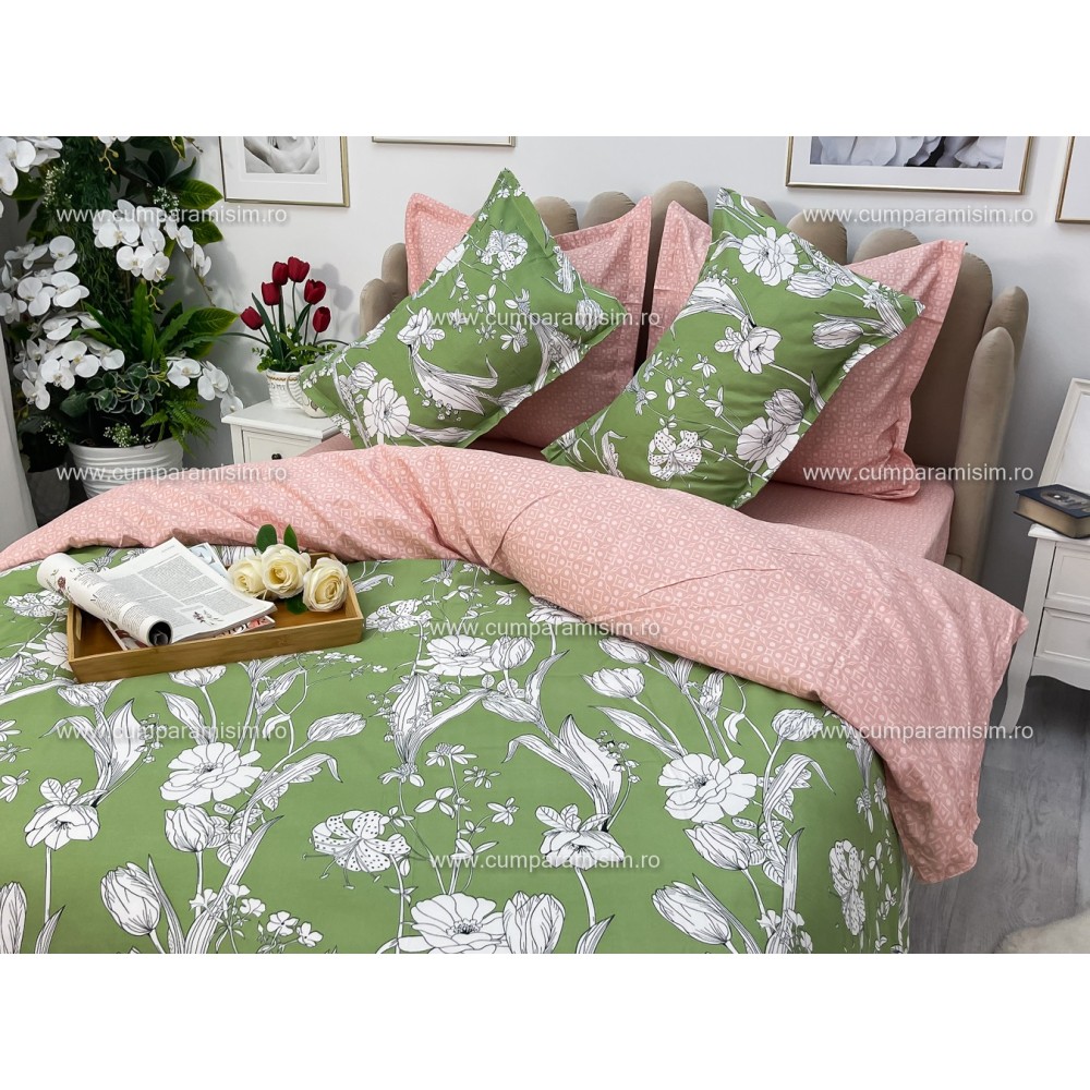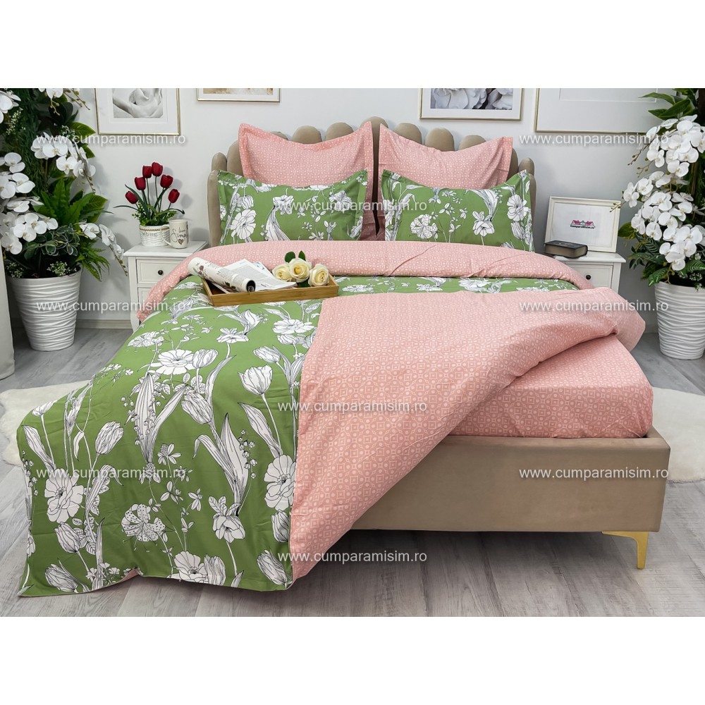 Lenjerie pat dublu, Ralex Pucioasa, Finet, 6 piese, Verde-Roz, flori, cod produs: RXF123