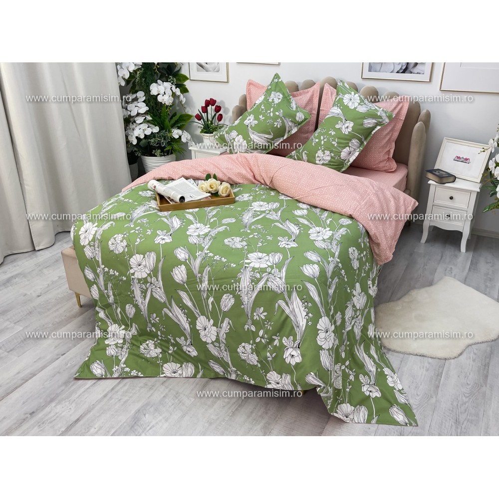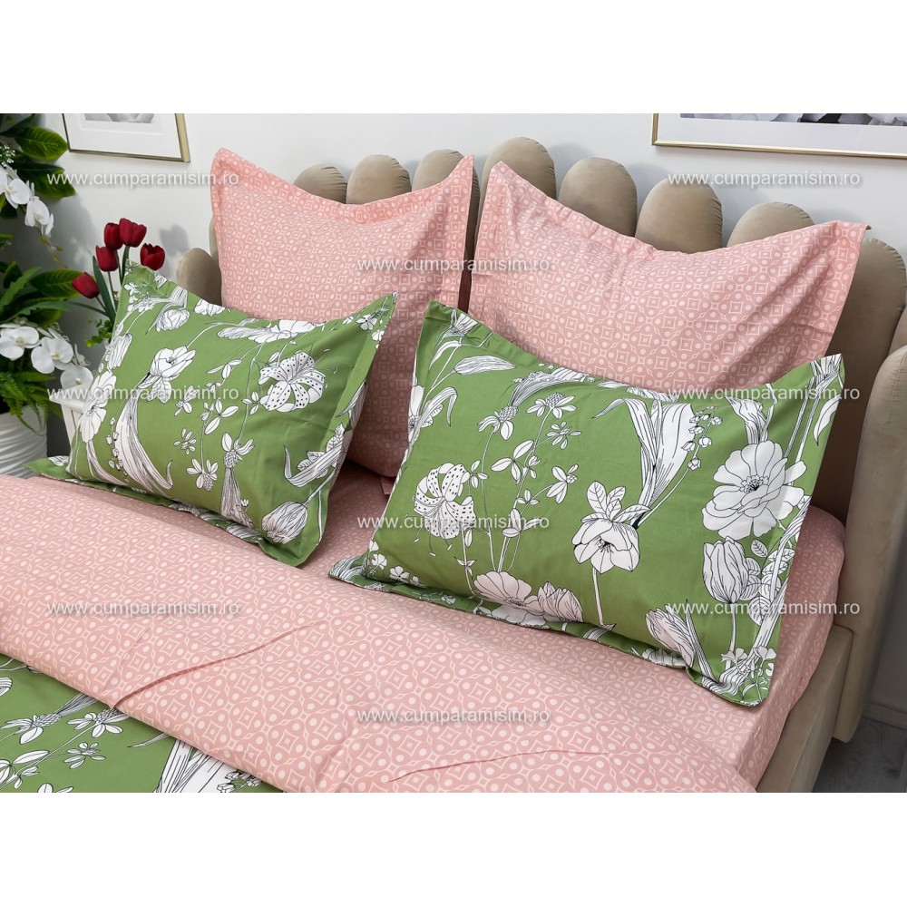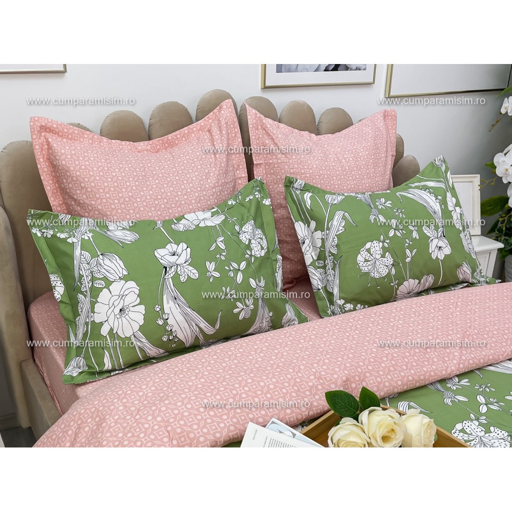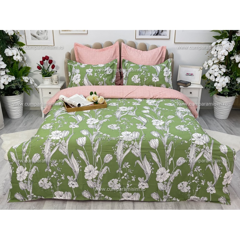 Lenjerie pat dublu, Ralex Pucioasa, Finet, 6 piese, Verde-Roz, flori, cod produs: RXF123