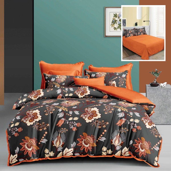 Lenjerie pat dublu, Ralex Pucioasa, Finet, 6 piese, Gri-Caramiziu, frunze, flori, cod produs: RXF125