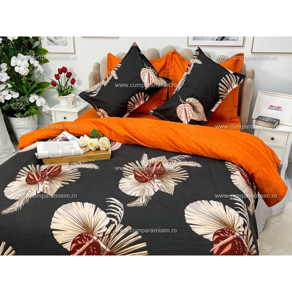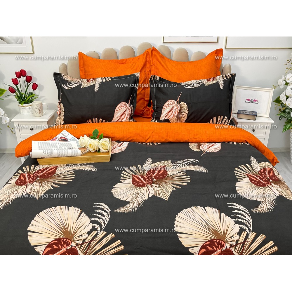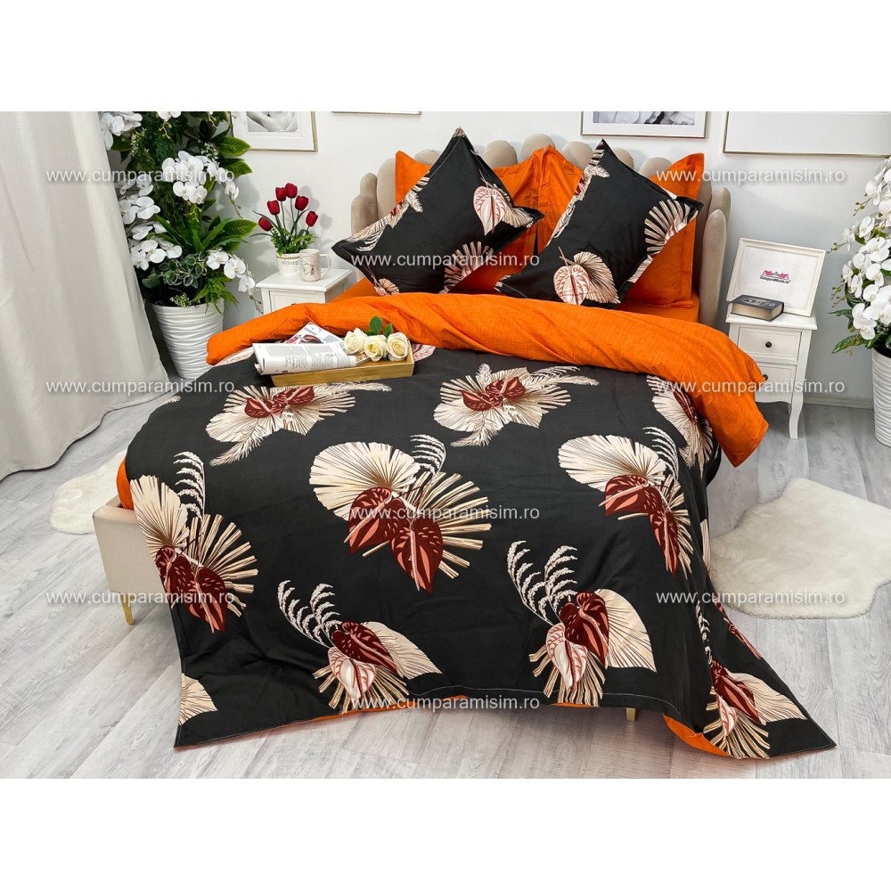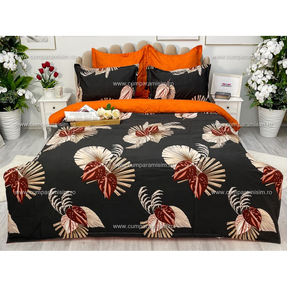 Lenjerie pat dublu, Ralex Pucioasa, Finet, 6 piese, Gri-Caramiziu, frunze, flori, cod produs: RXF126