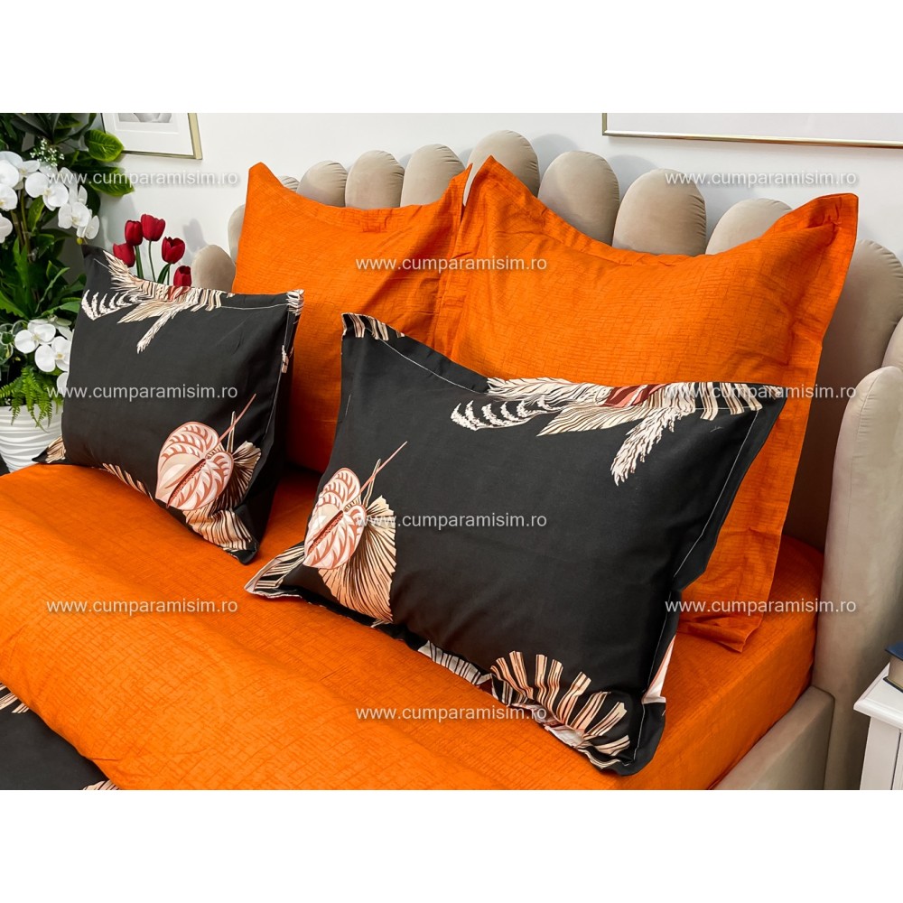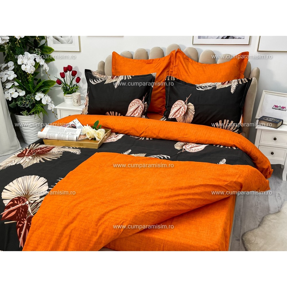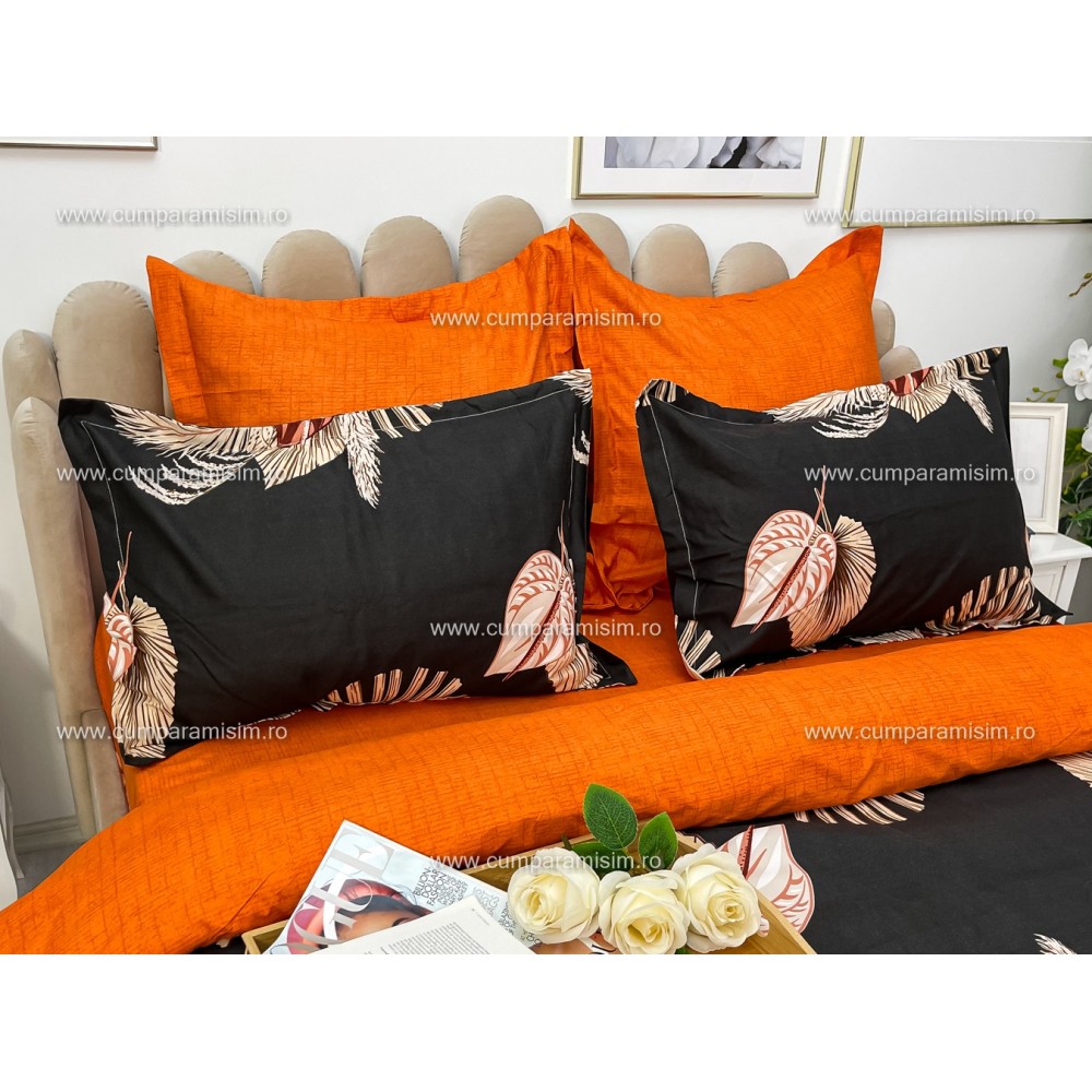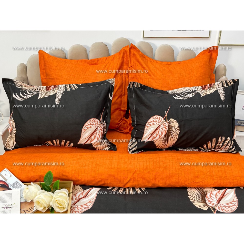 Lenjerie pat dublu, Ralex Pucioasa, Finet, 6 piese, Gri-Caramiziu, frunze, flori, cod produs: RXF126
