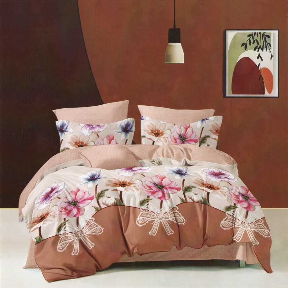 Lenjerie pat dublu, Ralex Pucioasa, Finet, 6 piese, Bej-Maro, flori, fundite, cod produs: RXF133