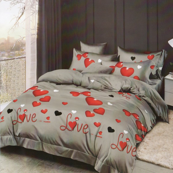 Lenjerie pat dublu, Ralex Pucioasa, Finet, 6 piese, Gri-Rosu, inimioare, cod produs: RXF134