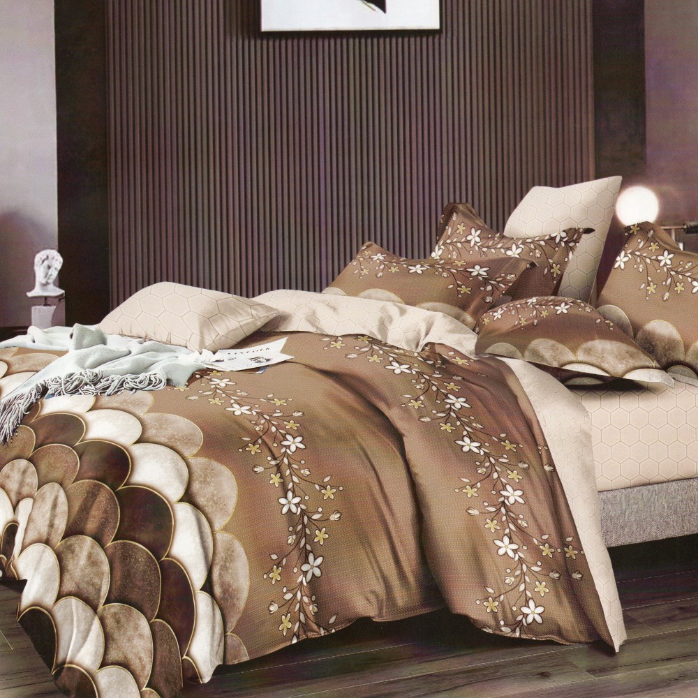 Lenjerie pat dublu, Ralex Pucioasa, Finet, 6 piese, Maro-Bej, flori, cod produs: RXF139