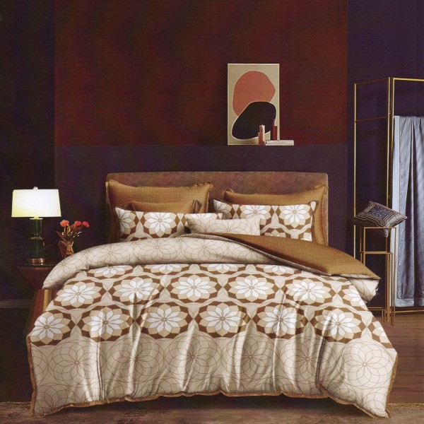 Lenjerie pat dublu, Ralex Pucioasa, Finet, 6 piese, Bej-Maro, flori, cod produs: RXF148