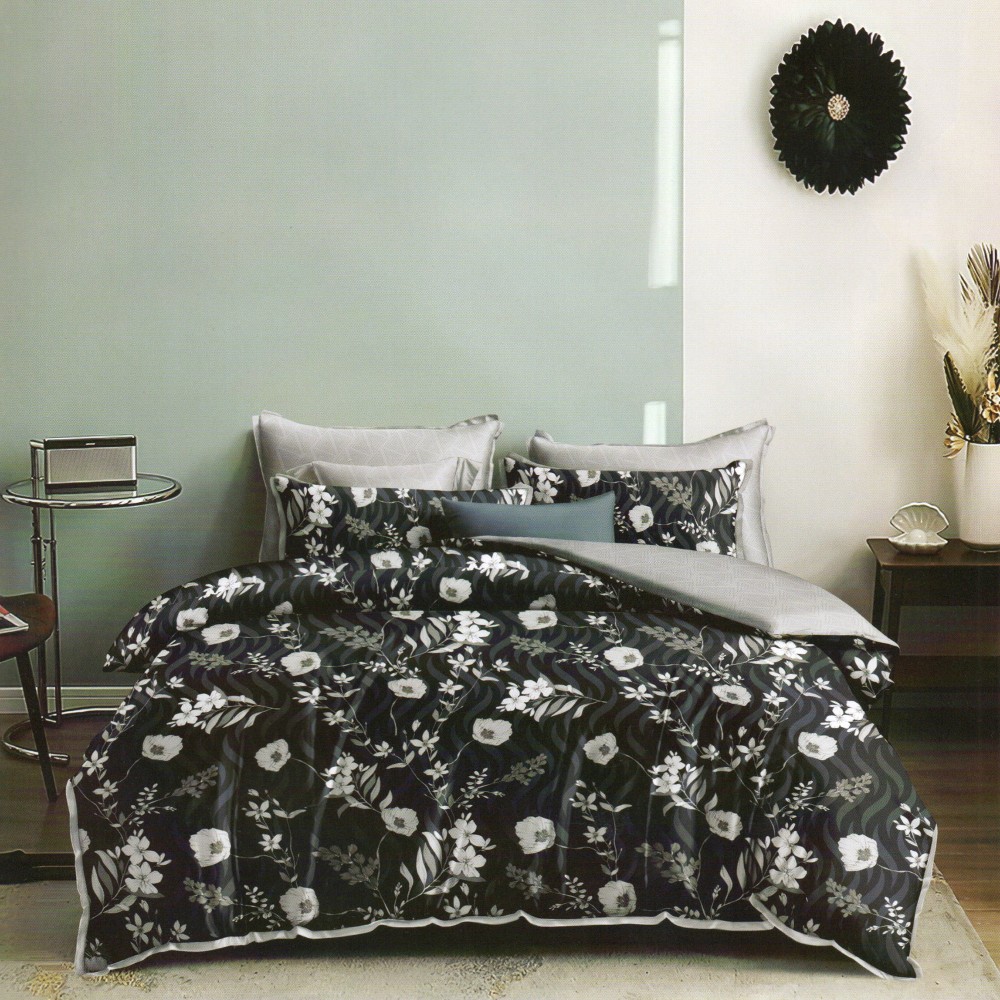 Lenjerie pat dublu, Ralex Pucioasa, Finet, 6 piese, Negru-Gri, flori, cod produs: RXF151