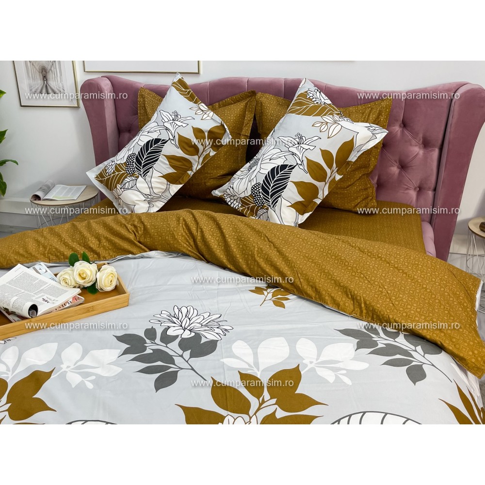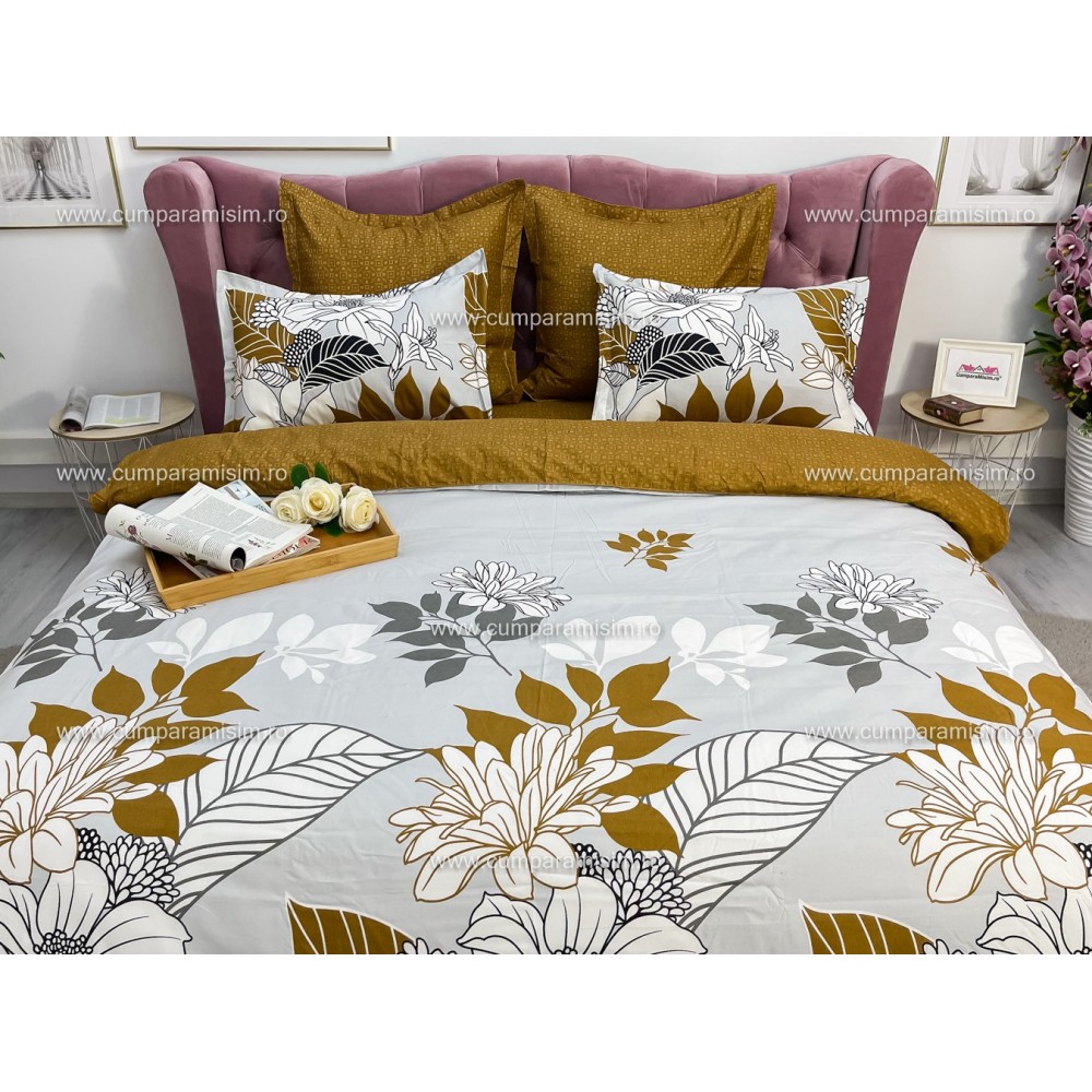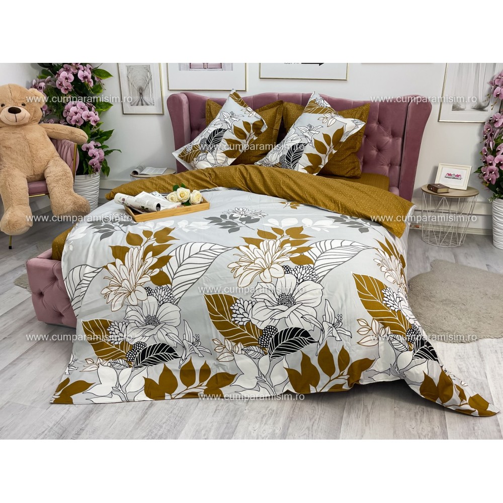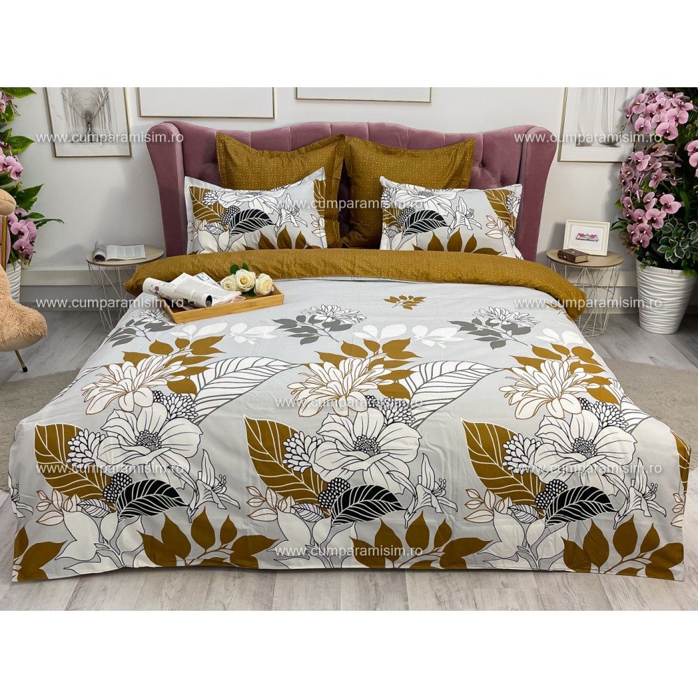 Lenjerie pat dublu, Ralex Pucioasa, Finet, 6 piese, Bej-Maro, flori, cod produs: RXF162