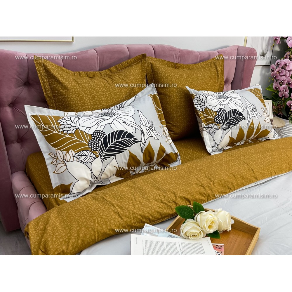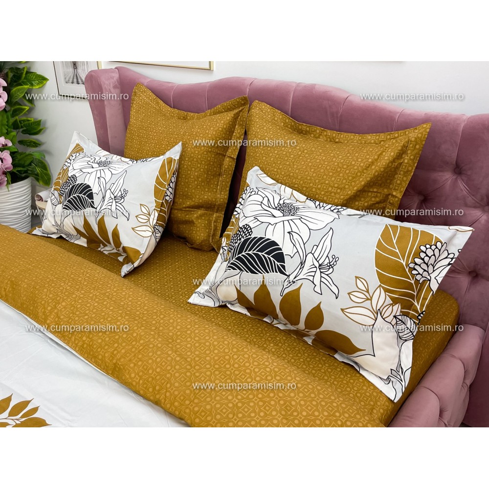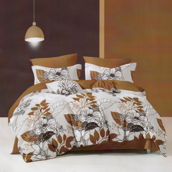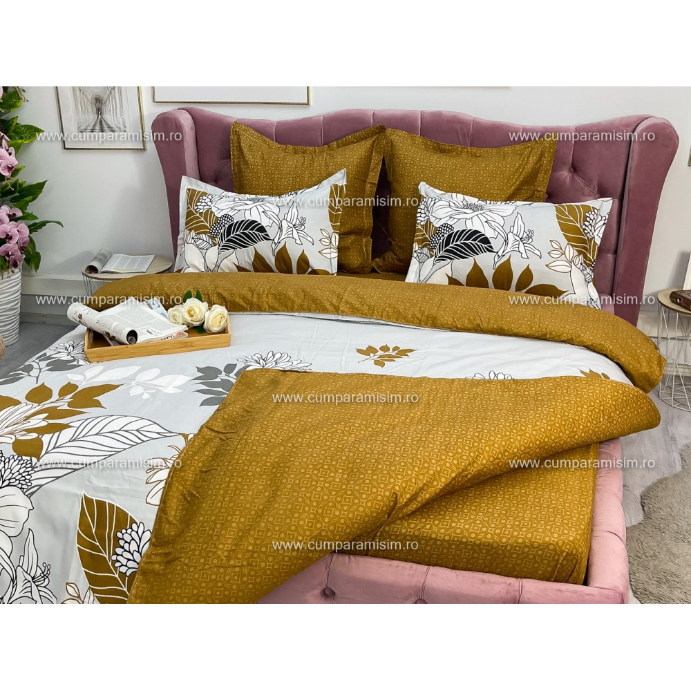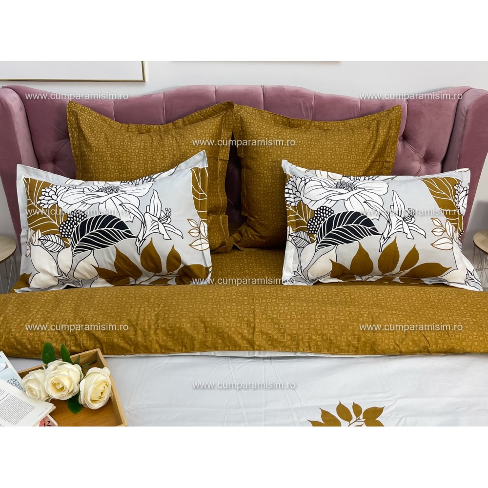 Lenjerie pat dublu, Ralex Pucioasa, Finet, 6 piese, Bej-Maro, flori, cod produs: RXF162
