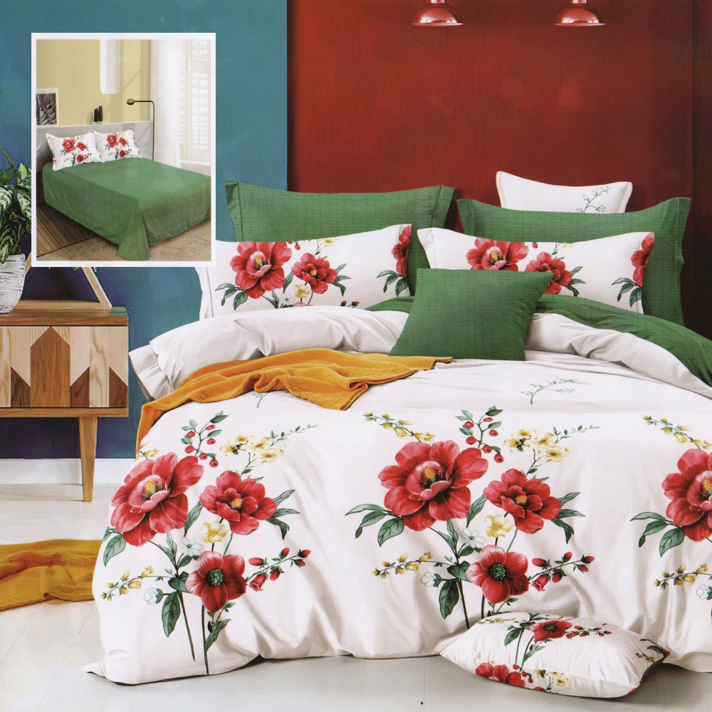 Lenjerie pat dublu, Ralex Pucioasa, Finet, 6 piese, Alb-Verde, flori, cod produs: RXF164