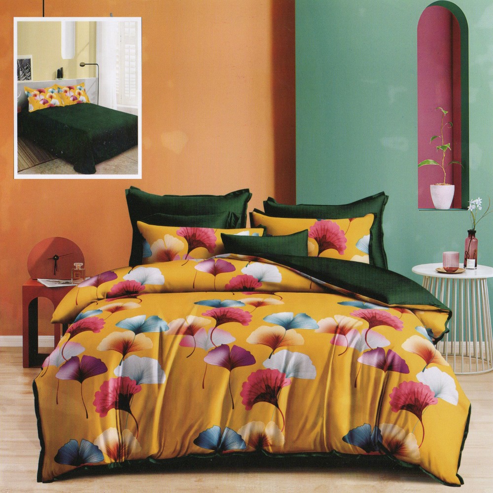 Lenjerie pat dublu, Ralex Pucioasa, Finet, 6 piese, Portocaliu-Verde, frunze, cod produs: RXF167