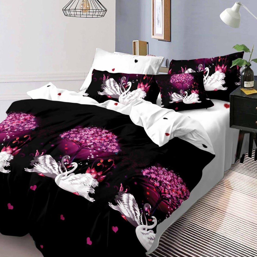 Lenjerie pat dublu, Ralex Pucioasa, Finet, 6 piese, Bleumarin-Alb, lebede, copaci, inimioare, cod produs: RXF178