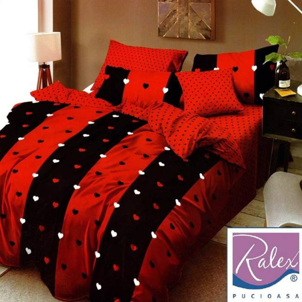 Lenjerie pat dublu, Ralex Pucioasa, Finet, 6 piese, Rosu-Negru, inimioare, cod produs: RXF181