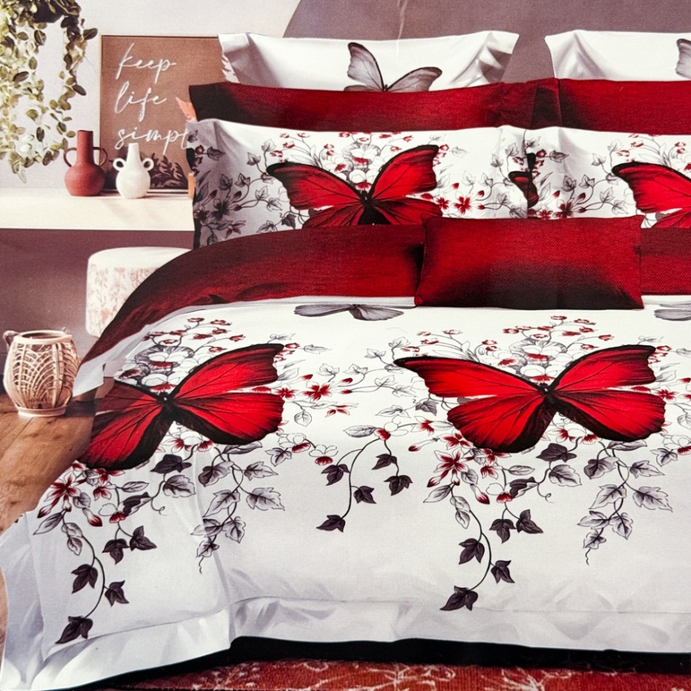 Lenjerie pat dublu, FINET, 6 piese, Roșu, Alb, flori, fluturi, Johny Home Pucioasa, cod produs: DKF190