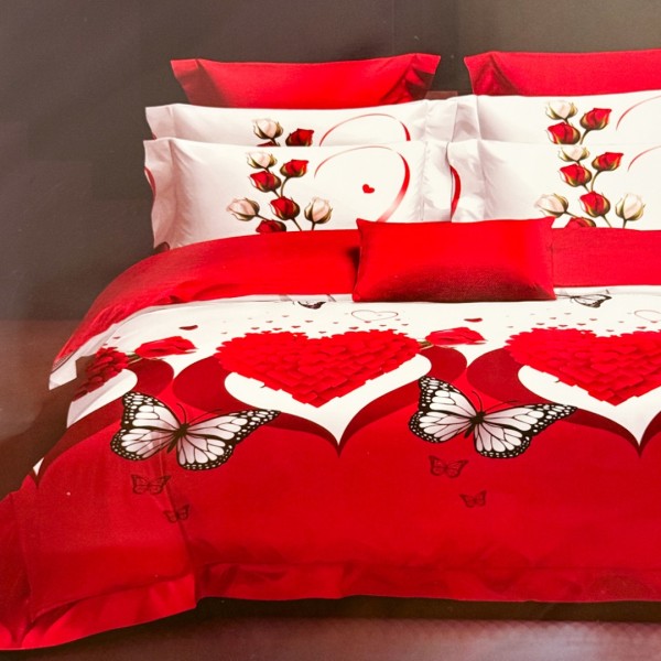 Lenjerie pat dublu, FINET, 6 piese, Roșu, Alb, inimioare, fluturi, Johny Home Pucioasa, cod produs: DKF192