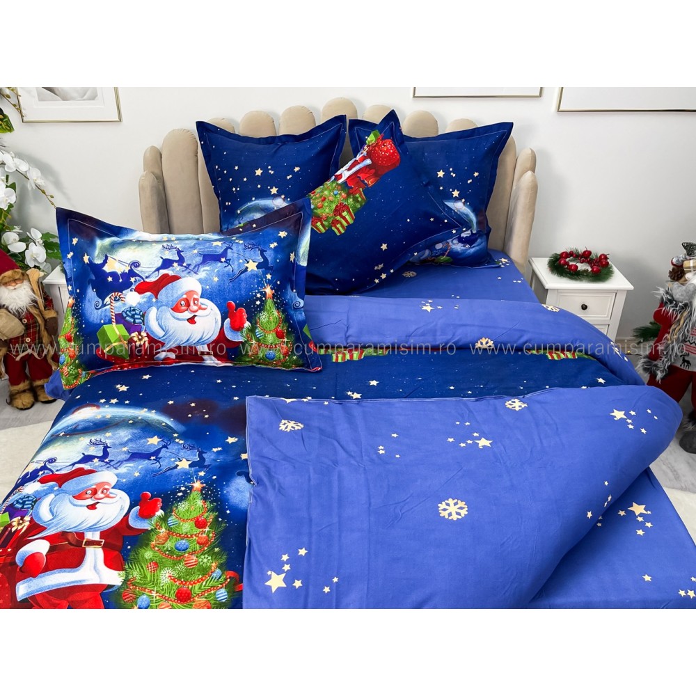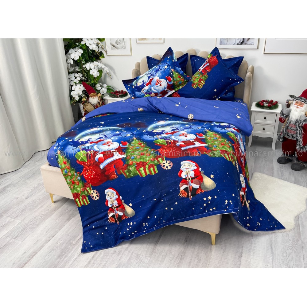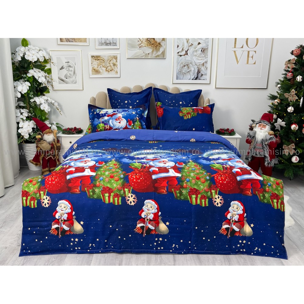 Lenjerie pat dublu, FINET, 6 piese, Craciun, Jojo Home, Bleumarin-Multicolor, Mos Craciun, brazi, cadouri, cod produs: JOM7