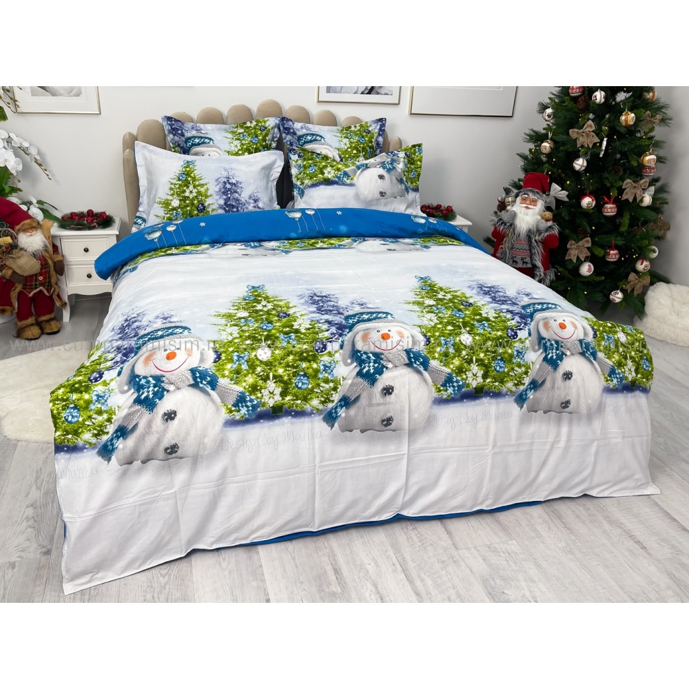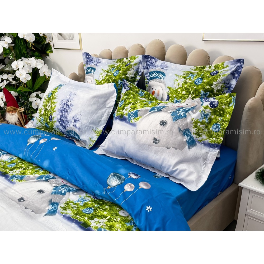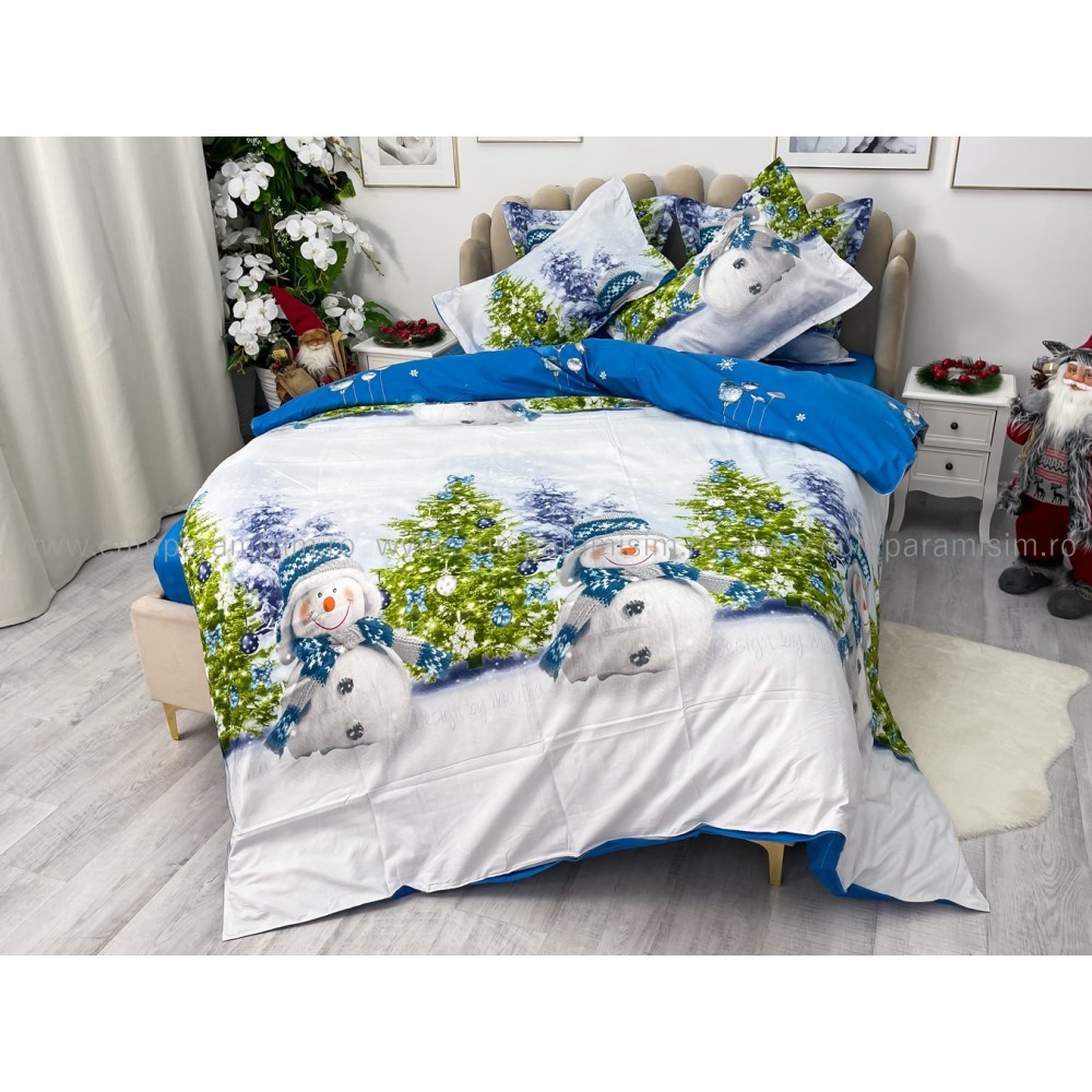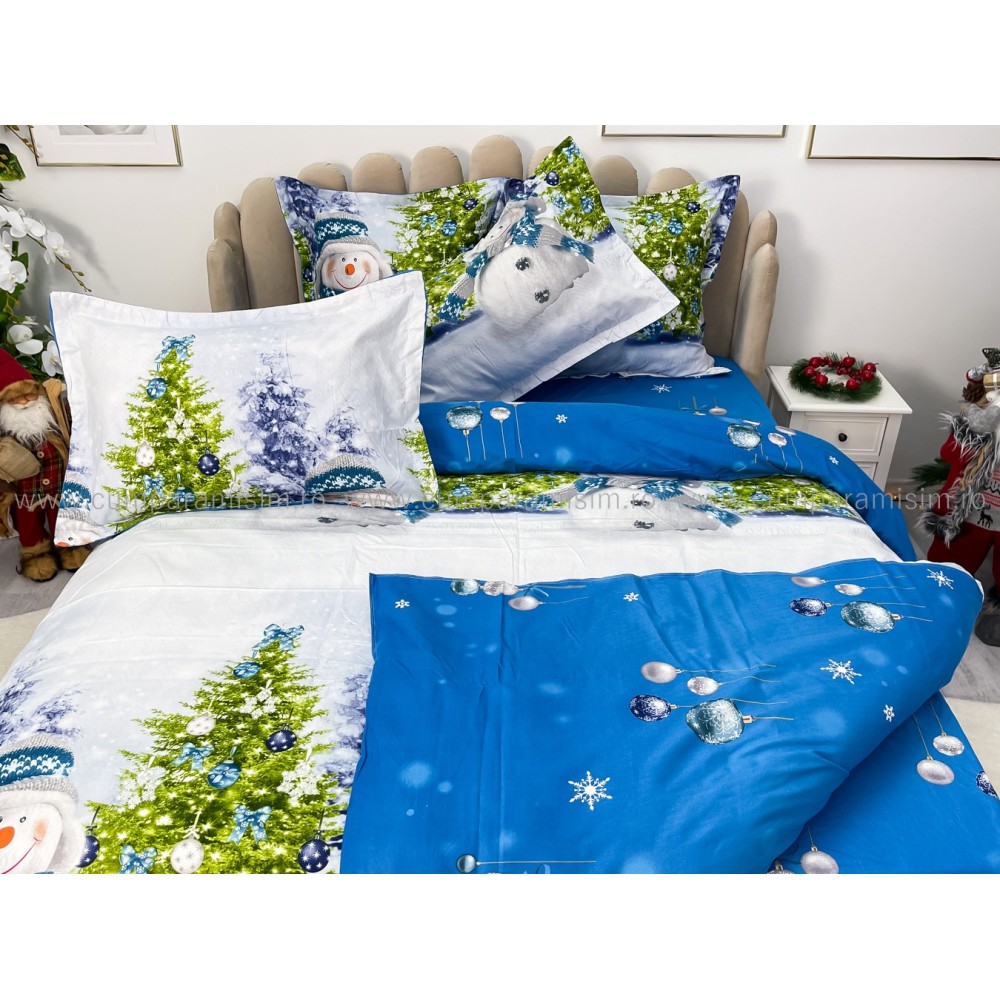 Lenjerie pat dublu, FINET, 6 piese, Craciun, Jojo Home, Bleu-Multicolor, oameni de zapada, brazi, cod produs: JOM17