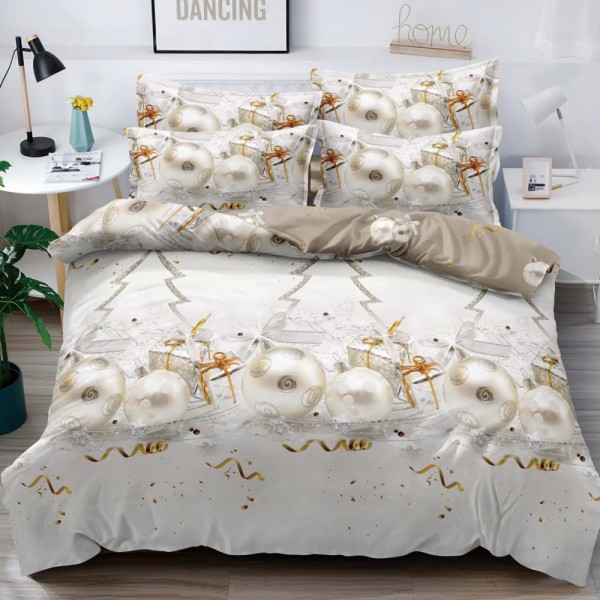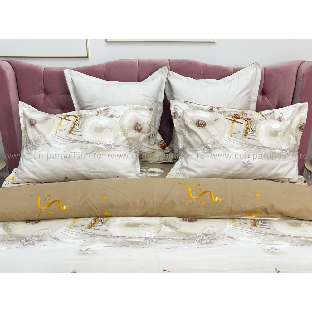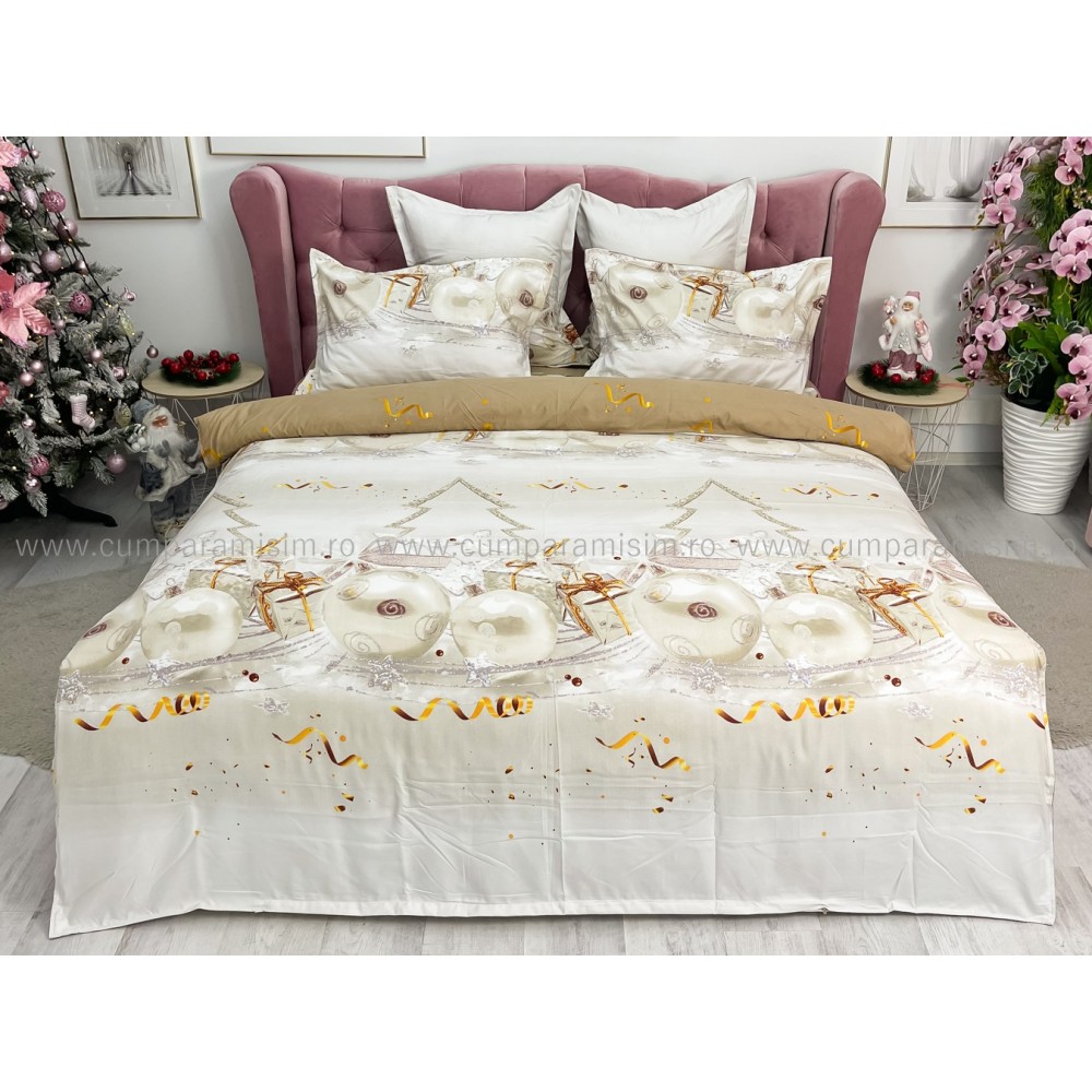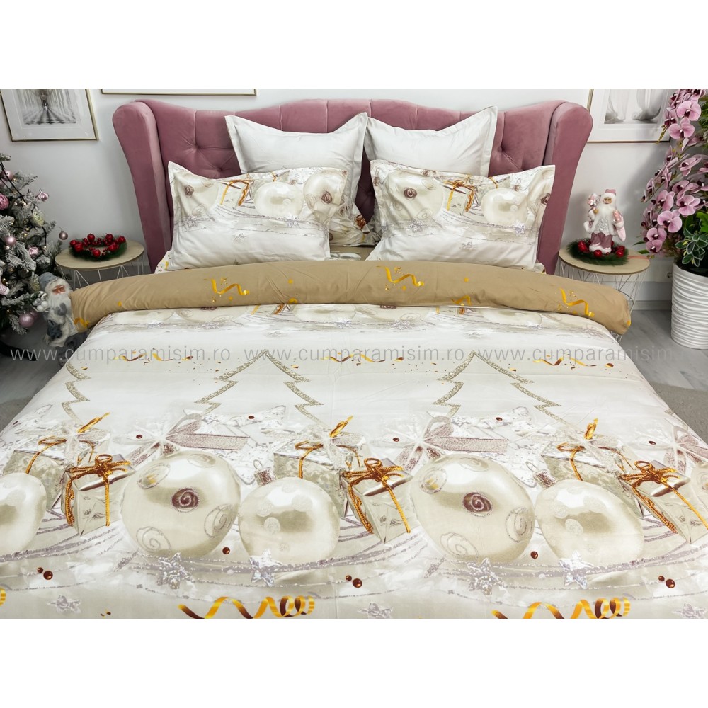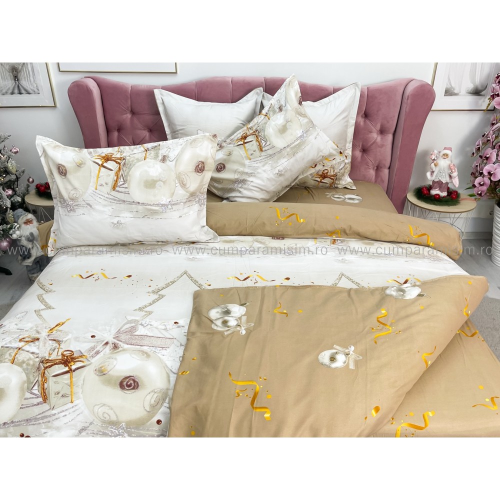 Lenjerie pat dublu, FINET, 6 piese, Craciun, Jojo Home, Crem-Bej, globulete, cod produs: JOM5