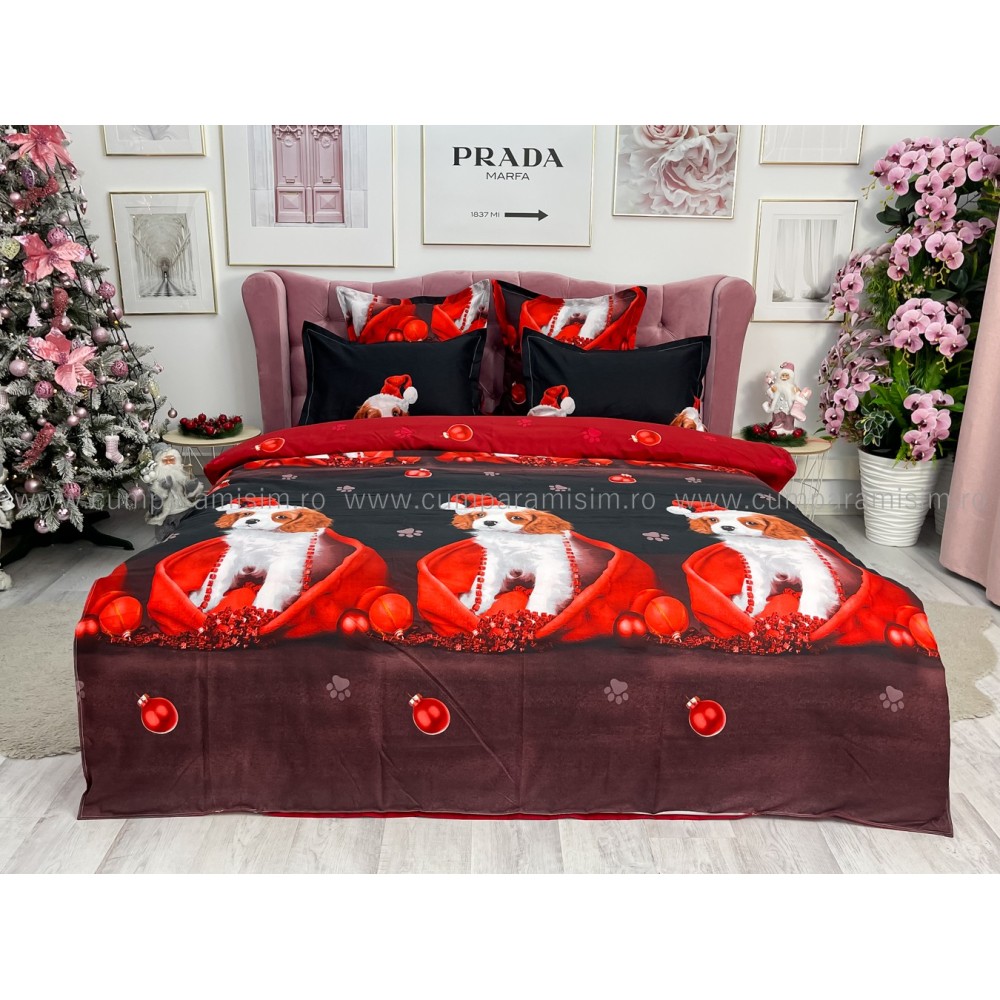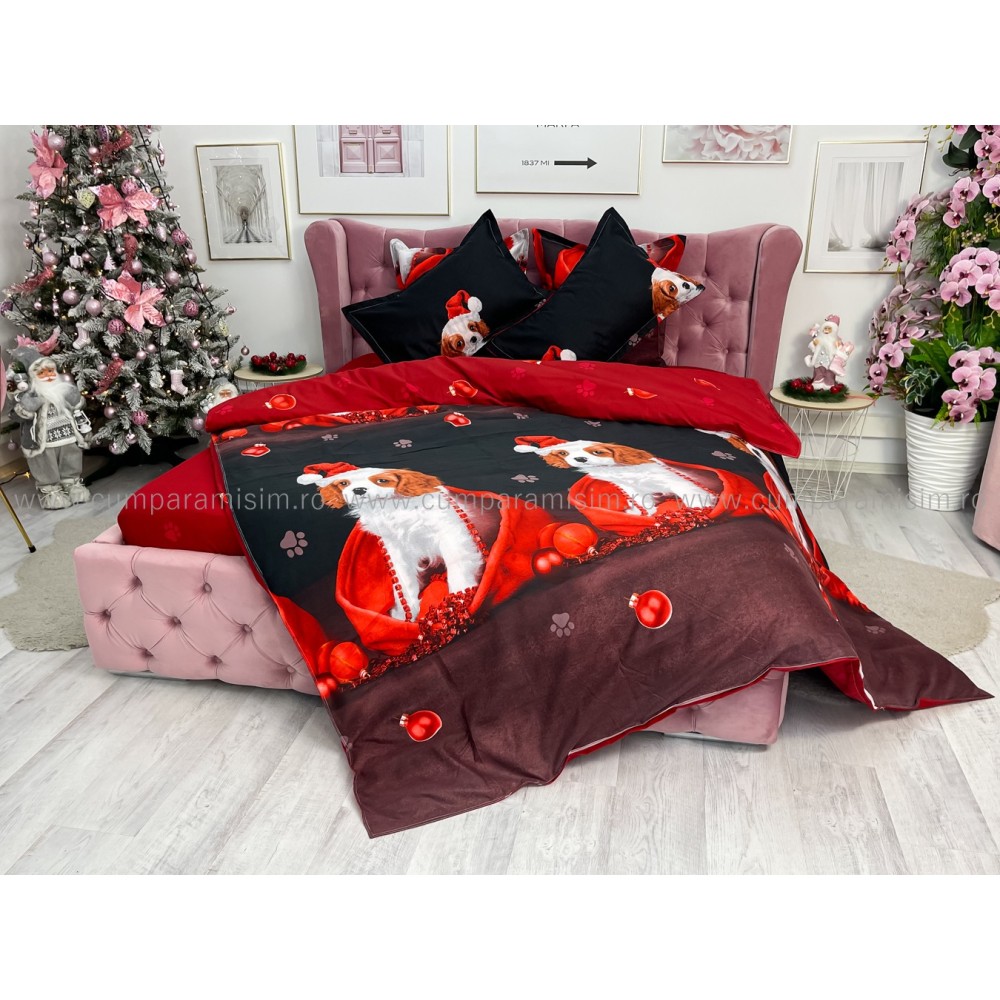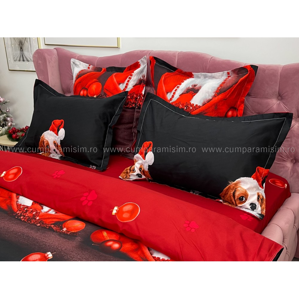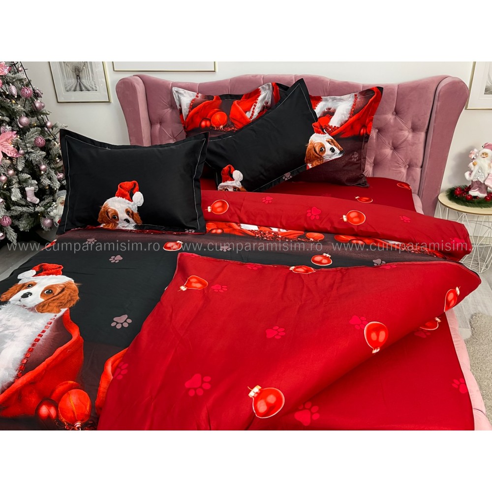 Lenjerie pat dublu, FINET, 6 piese, Craciun, Jojo Home, Rosu-Negru, catelusi, cod produs: JOM29