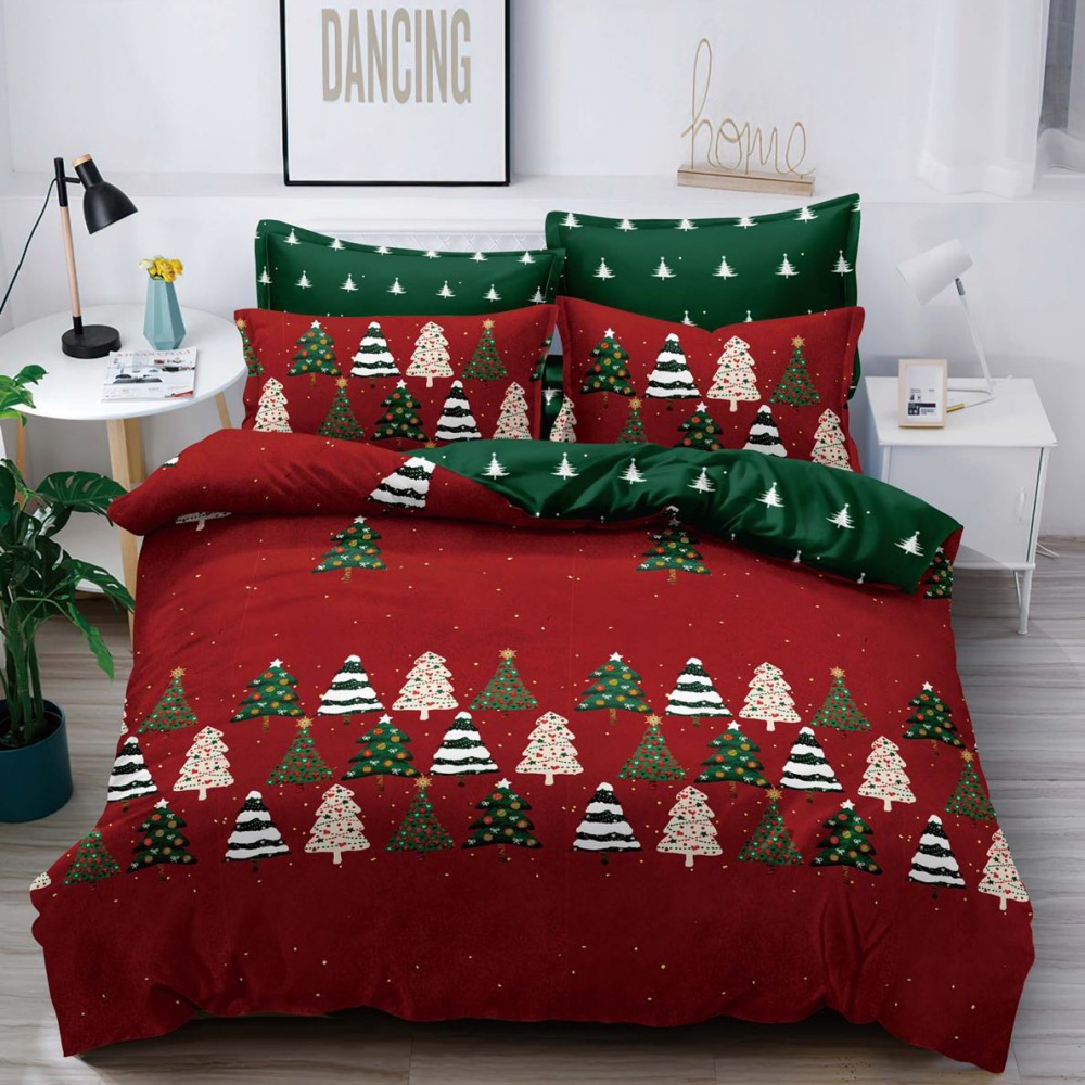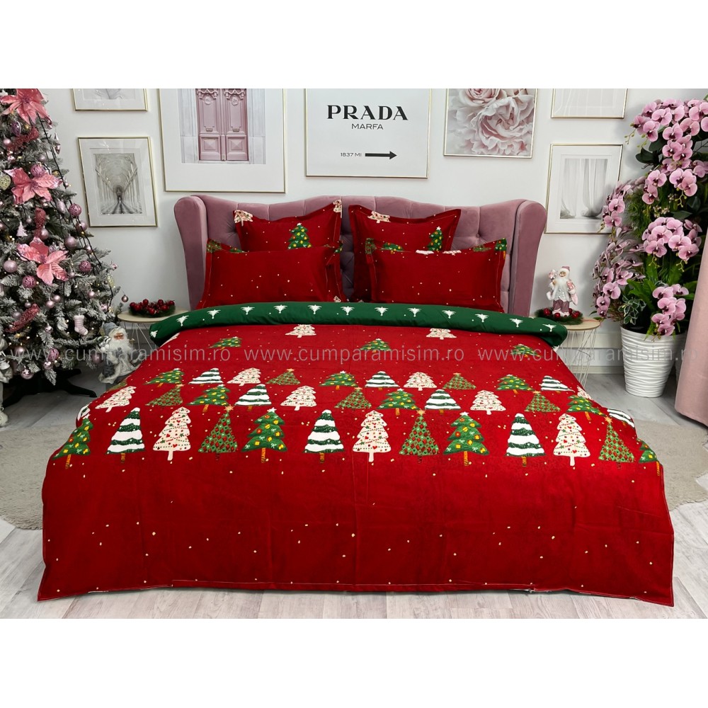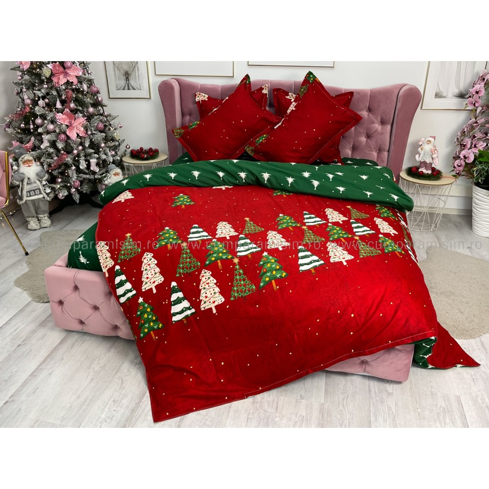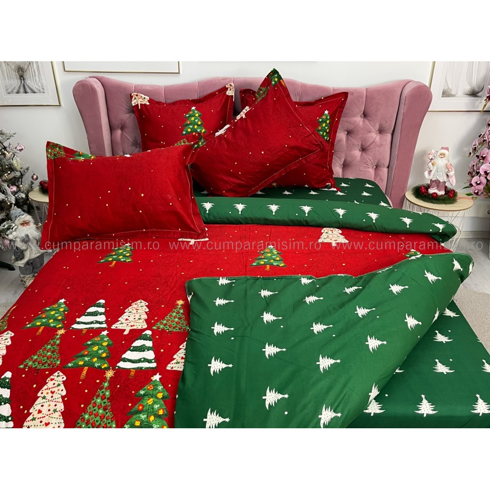 Lenjerie pat dublu, FINET, 6 piese, Craciun, Jojo Home, Rosu-Verde, brazi, cod produs: JOM19